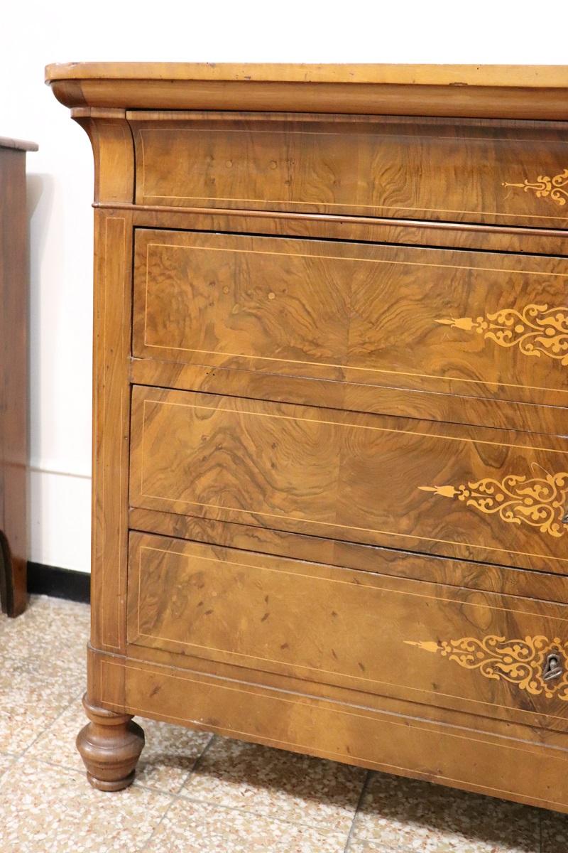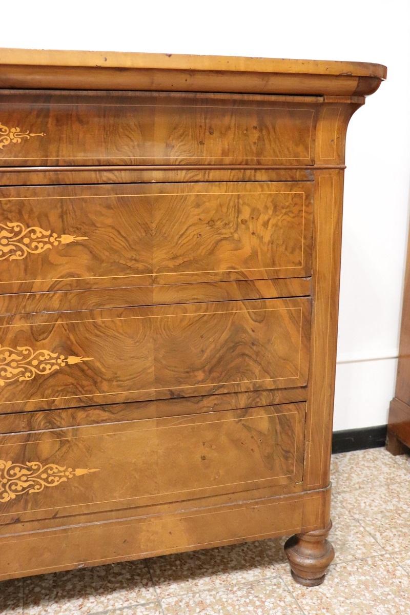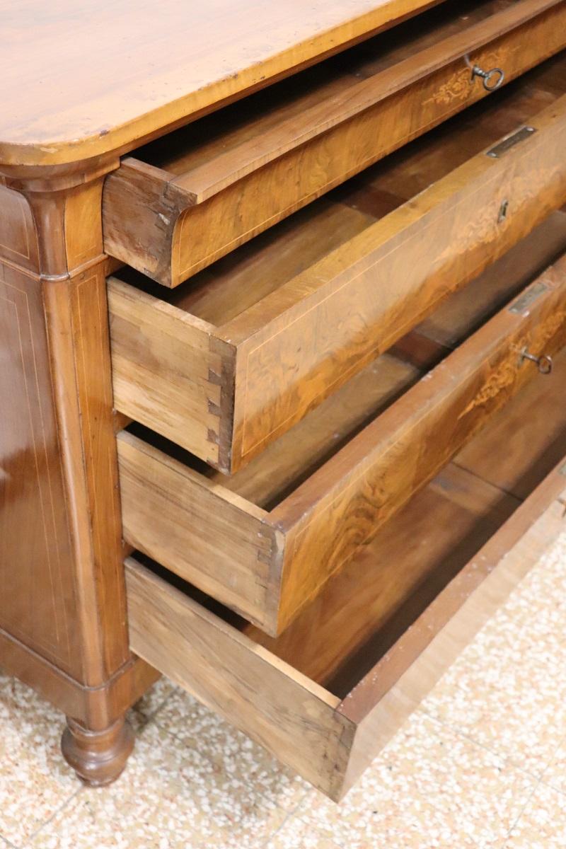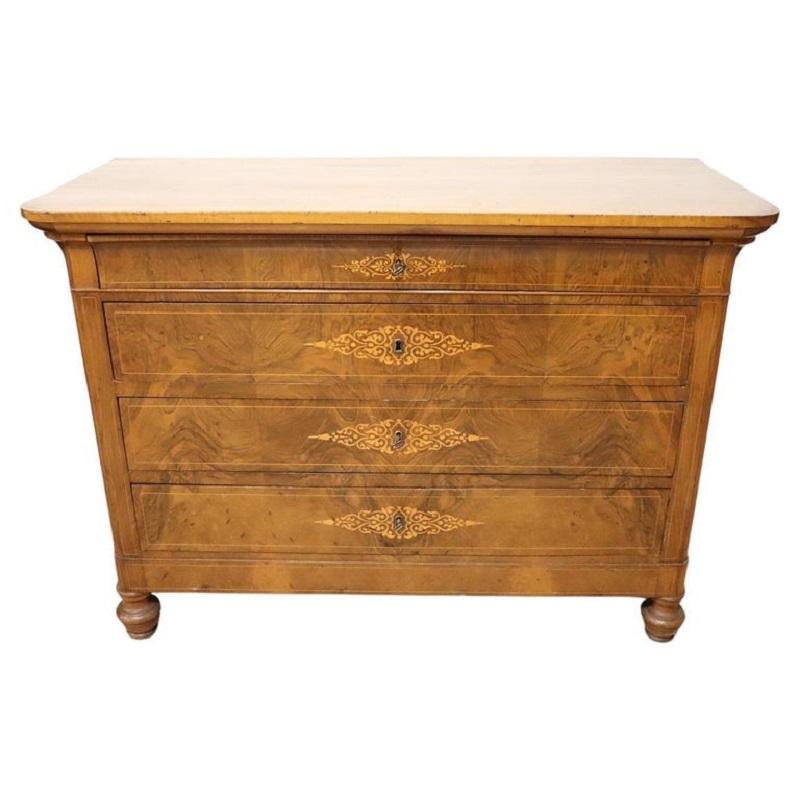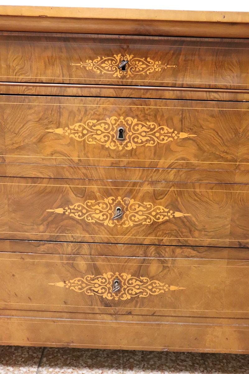 Cette élégante commode italienne ancienne datant de la première moitié du XIXe siècle, à l’époque de Charles X, allie une élégance intemporelle et un savoir-faire artisanal. Réalisée en bois de noyer précieux, elle présente de délicates décorations en marqueterie avec des boucles et des volutes sur le devant des tiroirs. Une décoration légère et raffinée, sans excès, qui met toutefois en valeur l’esthétique générale.