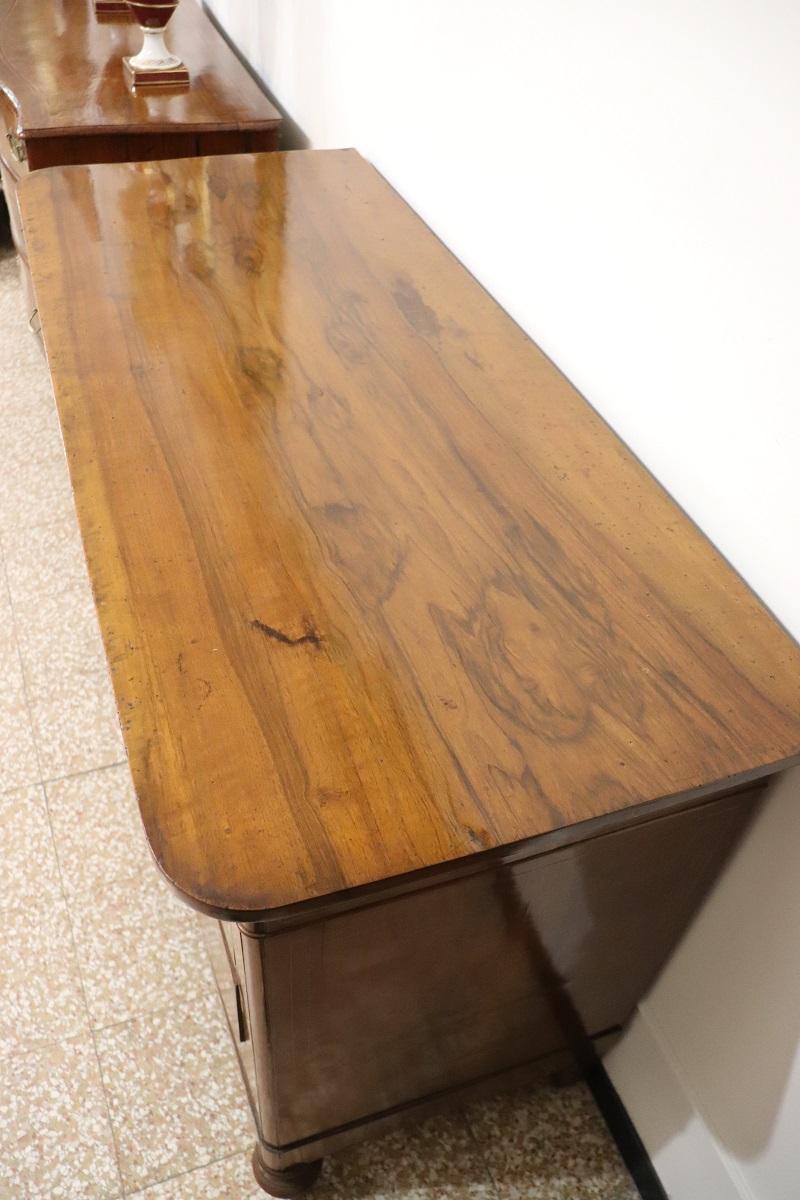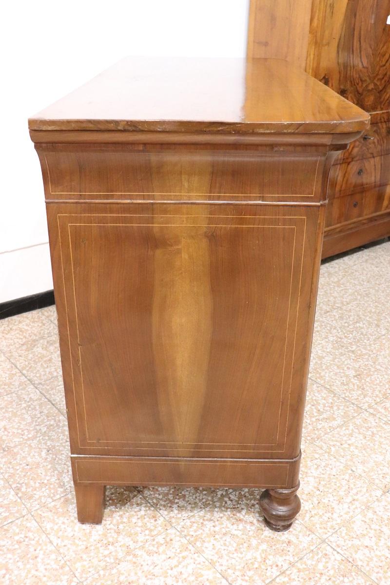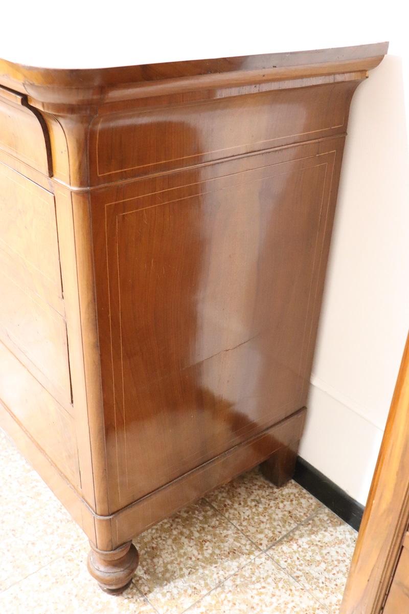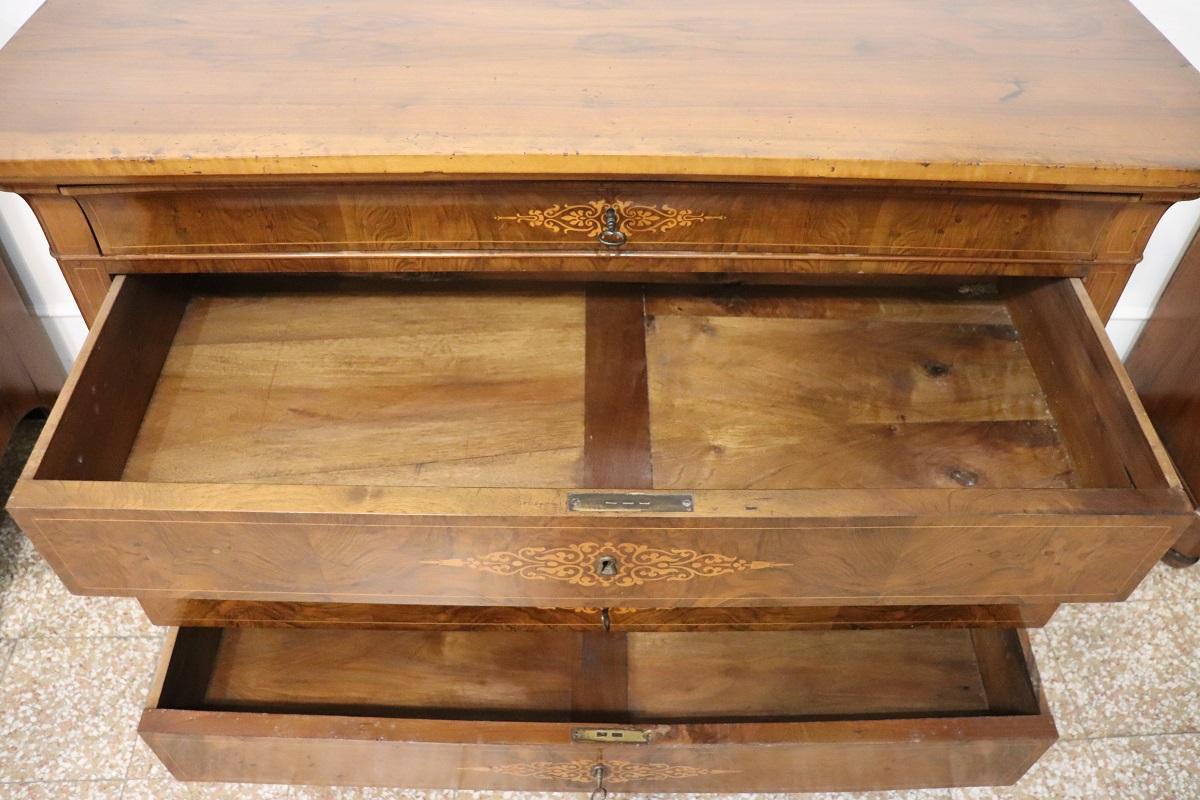 Cette élégante commode italienne ancienne datant de la première moitié du XIXe siècle, à l’époque de Charles X, allie une élégance intemporelle et un savoir-faire artisanal. Réalisée en bois de noyer précieux, elle présente de délicates décorations en marqueterie avec des boucles et des volutes sur le devant des tiroirs. Une décoration légère et raffinée, sans excès, qui met toutefois en valeur l’esthétique générale.