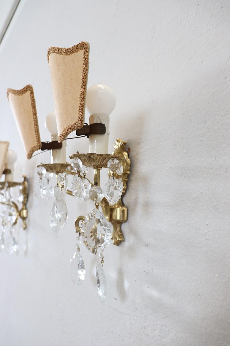 Questa raffinata coppia di appliques italiane della seconda metà del XX secolo incarna un’eleganza senza tempo. Realizzate in bronzo dorato finemente cesellato, ogni applique presenta un design classico con due bracci graziosamente curvati che sostengono due lampadine, completate da scintillanti gocce di cristallo che aggiungono un tocco di lusso e interesse visivo.