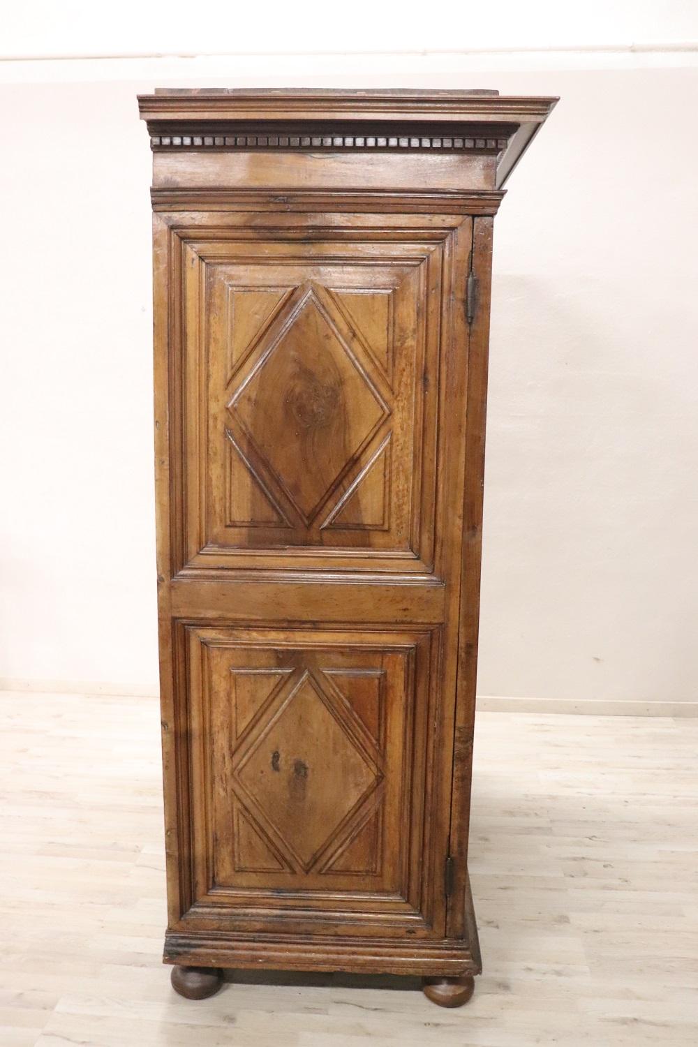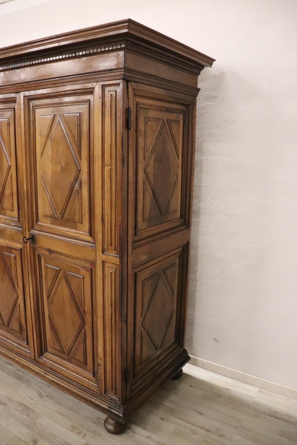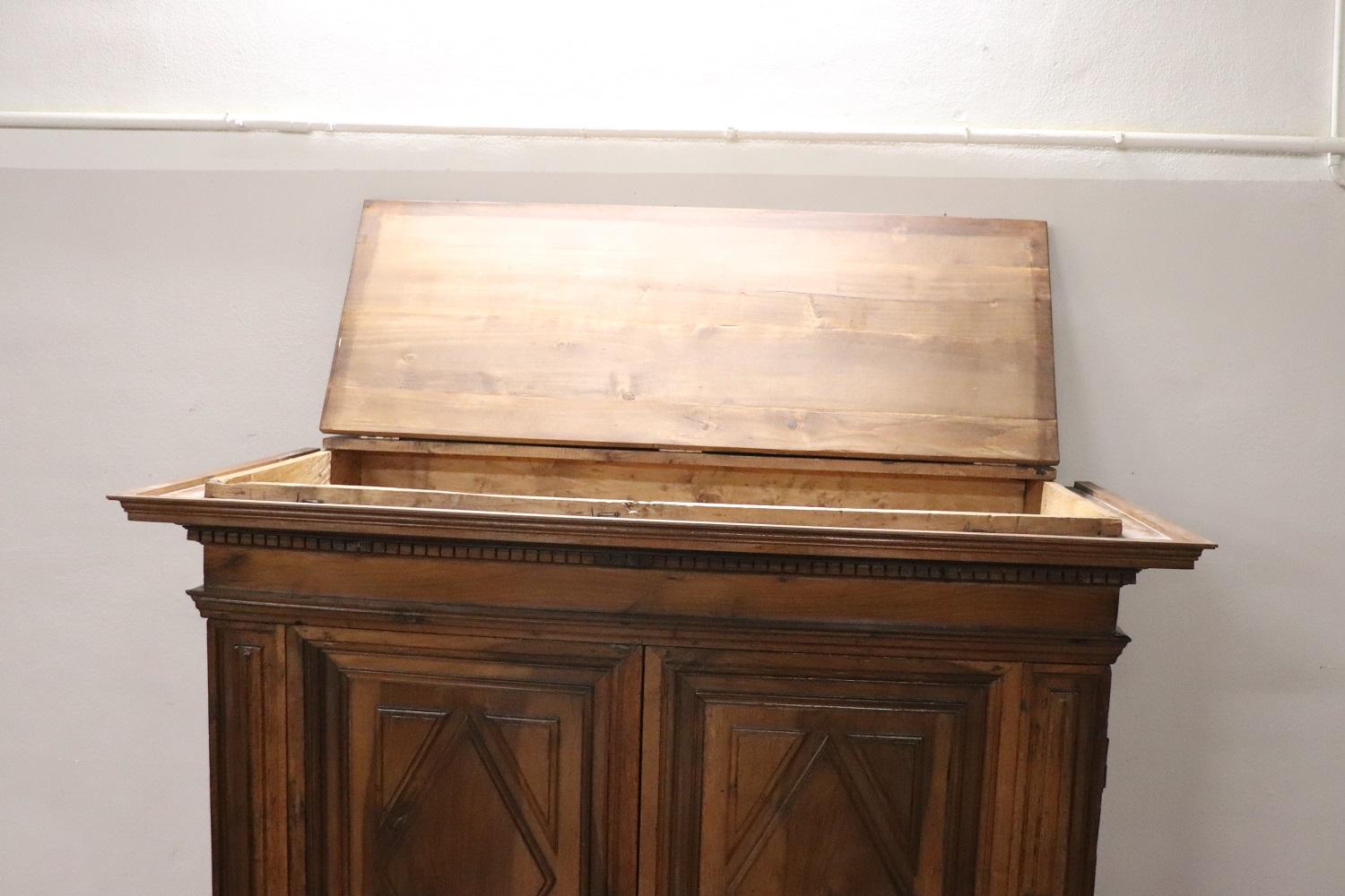 Raro e importante armadio antico italiano in noce massello realizzato verso la fine del XVII secolo del periodo Luigi XIV. La linea è infatti tipica di questo periodo di alta epoca che voleva questo tipo di arredi di grande imponenza realizzati in legno massello di noce. Caratterizzato da ante e fianchi con pannelli decorativi a motivo geometrico. Internamente è dotato di un’asta per appendere i vestiti, in origine c’erano dei ripiani che sono andati perduti. È possibile aggiungere dei ripiani se il cliente lo desidera. Presenta la chioderia e la ferramenta del XVII secolo. Il cappello è dotato di un vano segreto, la parte superiore si alza e può contenere oggetti riservati. Armadio di rara importanza. Perfette condizioni lignee da segnalare schiena non coeva, pronto per essere collocato nella stanza più importante della vostra casa.Molto semplice e lineare adatto per essere inserito anche in un ambiente moderno dove si voglia dare un tocco di calore. Vi consigliamo comunque di guardare bene in dettaglio tutte le foto allegate, schiena non coeva. Proposta ad un’ottimo prezzo trattabile vi invitiamo ad inviarci le vostre proposte di acquisto le valuteremo con piacere.