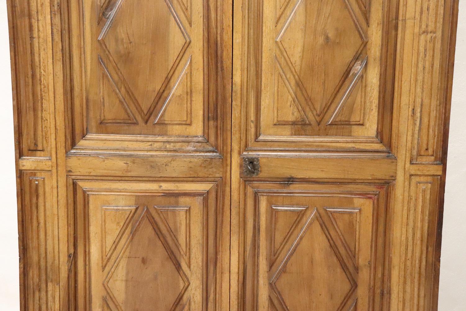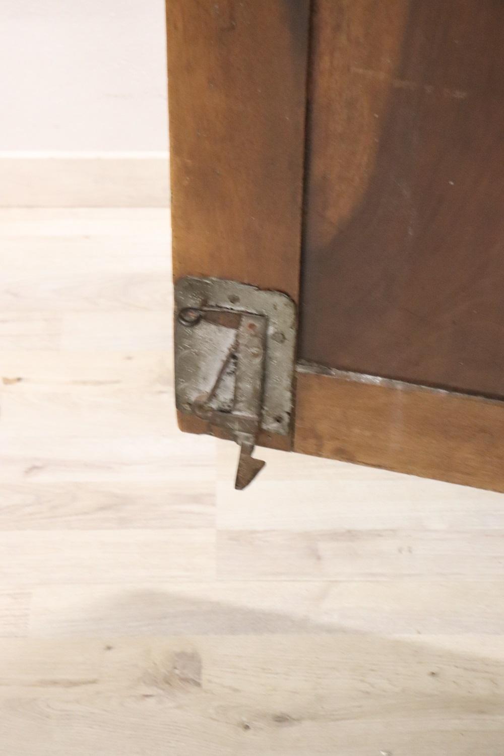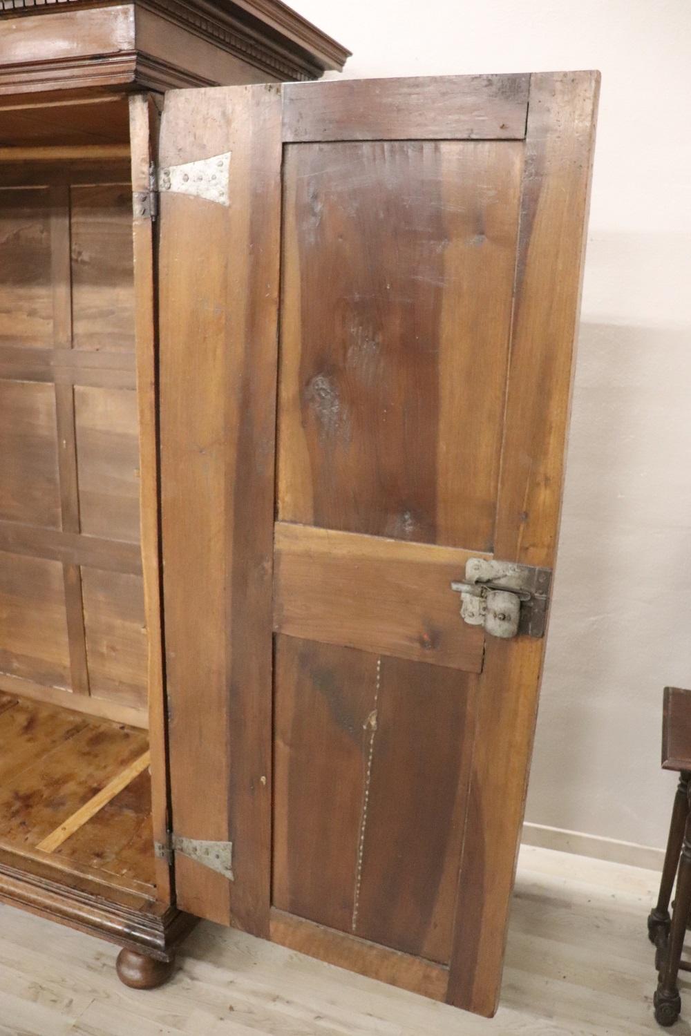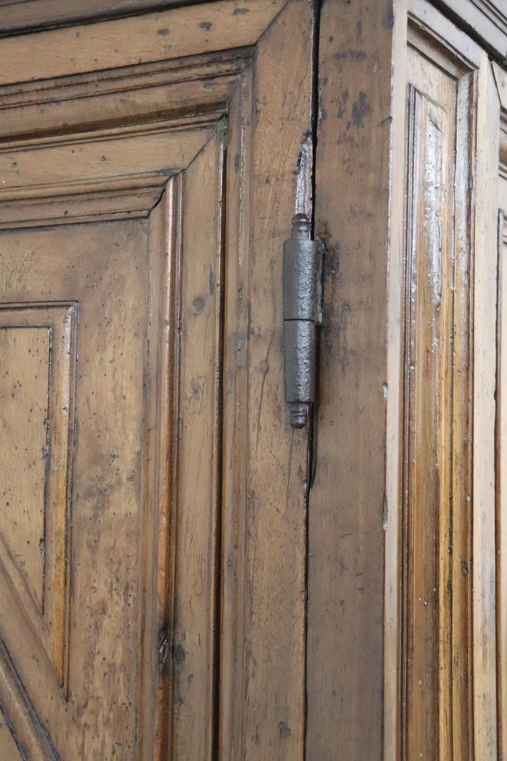Raro e importante armadio antico italiano in noce massello realizzato verso la fine del XVII secolo del periodo Luigi XIV. La linea è infatti tipica di questo periodo di alta epoca che voleva questo tipo di arredi di grande imponenza realizzati in legno massello di noce. Caratterizzato da ante e fianchi con pannelli decorativi a motivo geometrico. Internamente è dotato di un’asta per appendere i vestiti, in origine c’erano dei ripiani che sono andati perduti. È possibile aggiungere dei ripiani se il cliente lo desidera. Presenta la chioderia e la ferramenta del XVII secolo. Il cappello è dotato di un vano segreto, la parte superiore si alza e può contenere oggetti riservati. Armadio di rara importanza. Perfette condizioni lignee da segnalare schiena non coeva, pronto per essere collocato nella stanza più importante della vostra casa.Molto semplice e lineare adatto per essere inserito anche in un ambiente moderno dove si voglia dare un tocco di calore. Vi consigliamo comunque di guardare bene in dettaglio tutte le foto allegate, schiena non coeva. Proposta ad un’ottimo prezzo trattabile vi invitiamo ad inviarci le vostre proposte di acquisto le valuteremo con piacere.