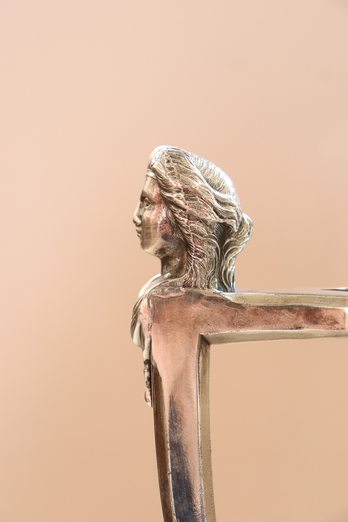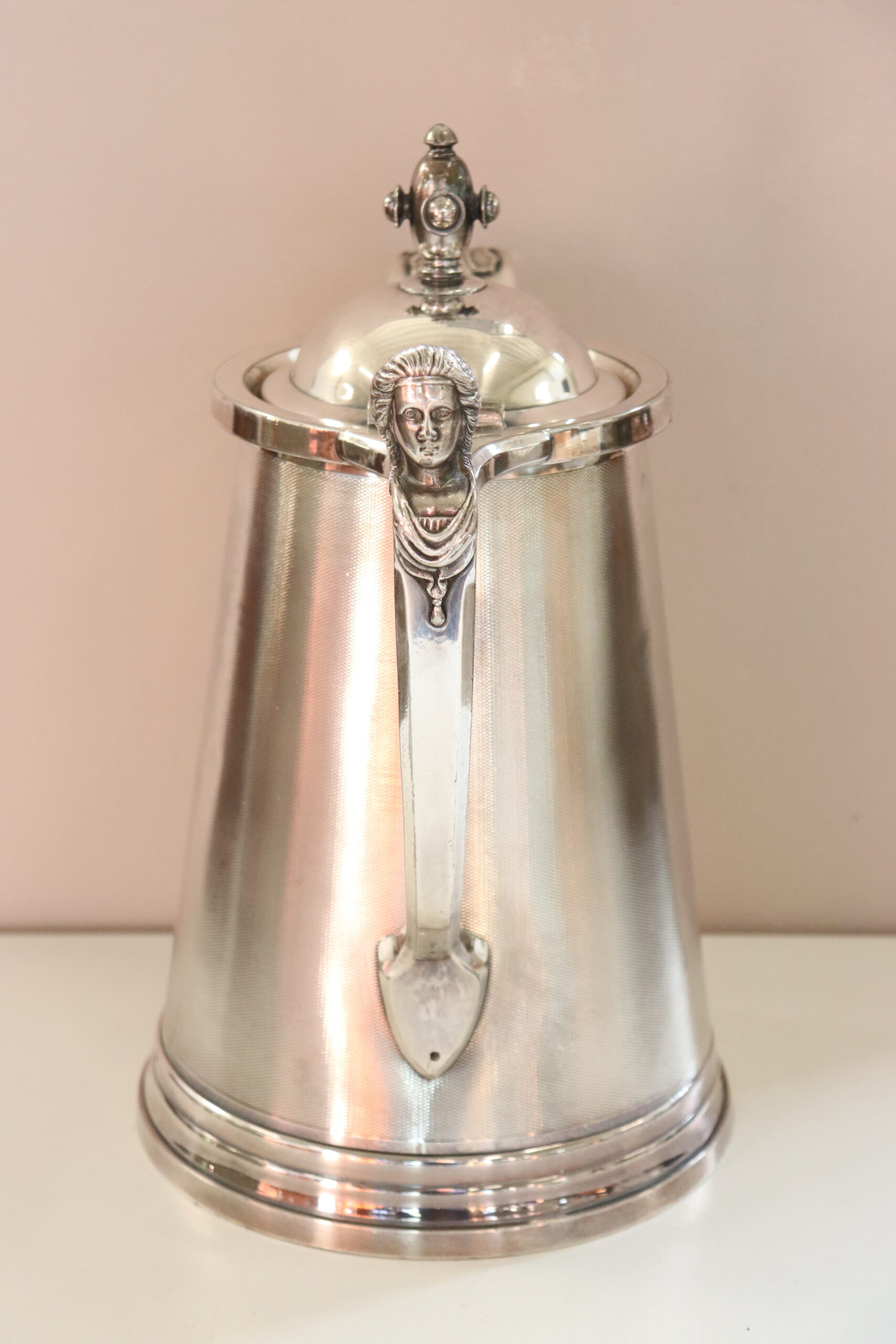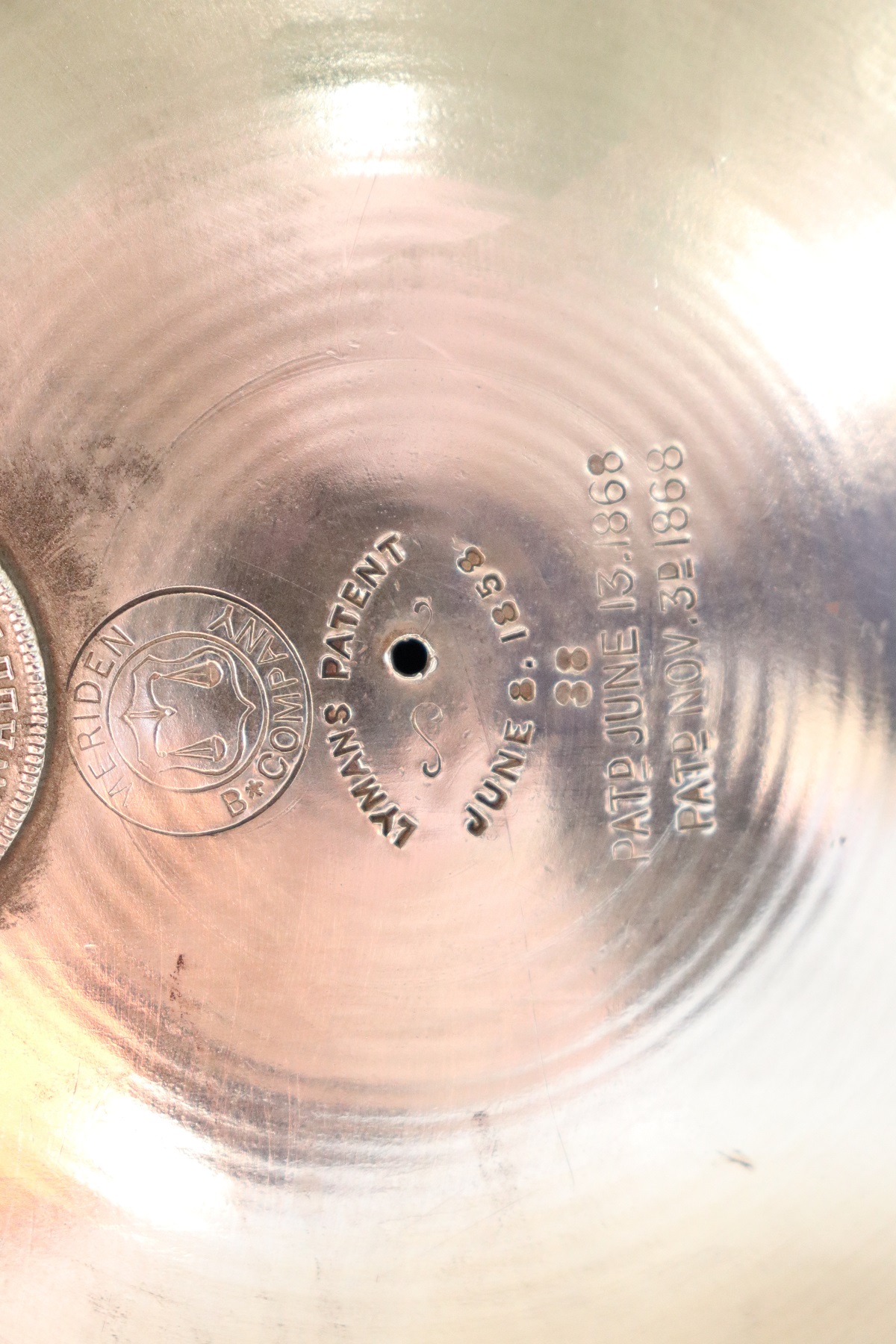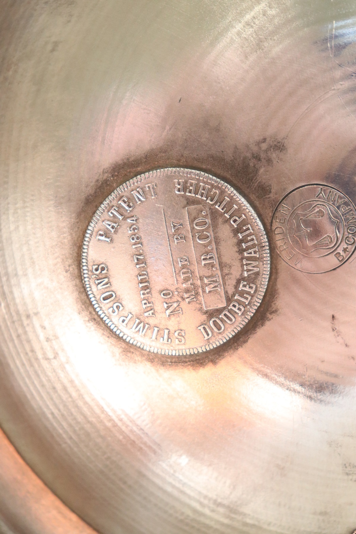 RAFFINATA GRANDE BROCCA IN METALLO CON ELEMENTI DECORATIVI DI GUSTO CLASSICO PLACCATA ARGENTO MANIFATTURA AMERICANA MARCHIO STIMPSON DATABILE INTORNO AL 1868. RAFFINATO OGGETTO DECORATIVO PER LA CASA