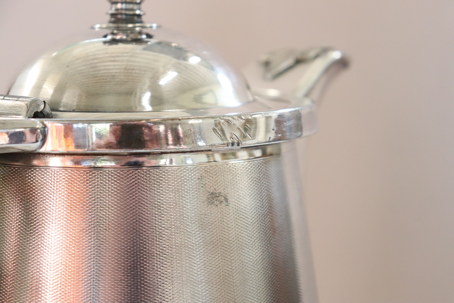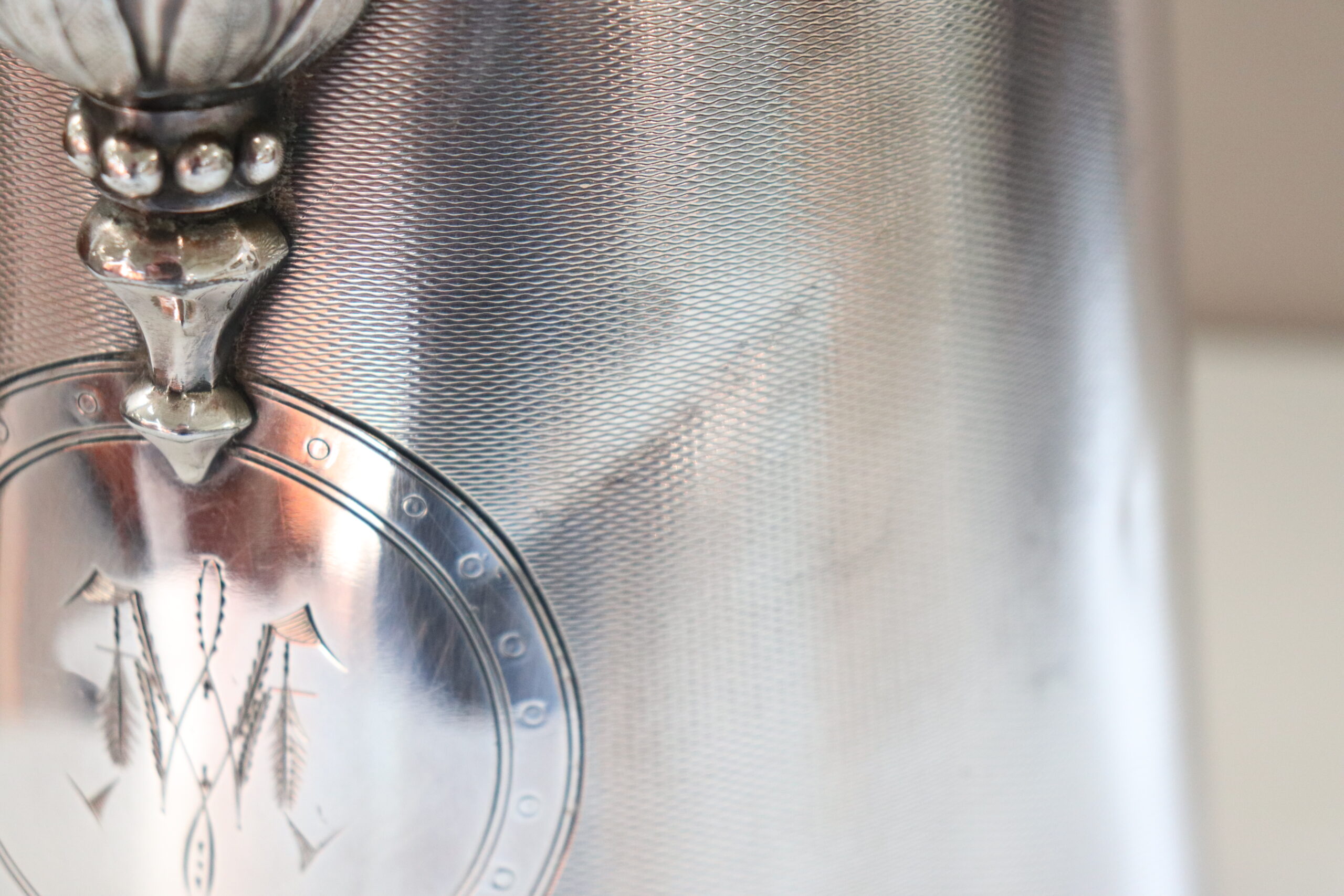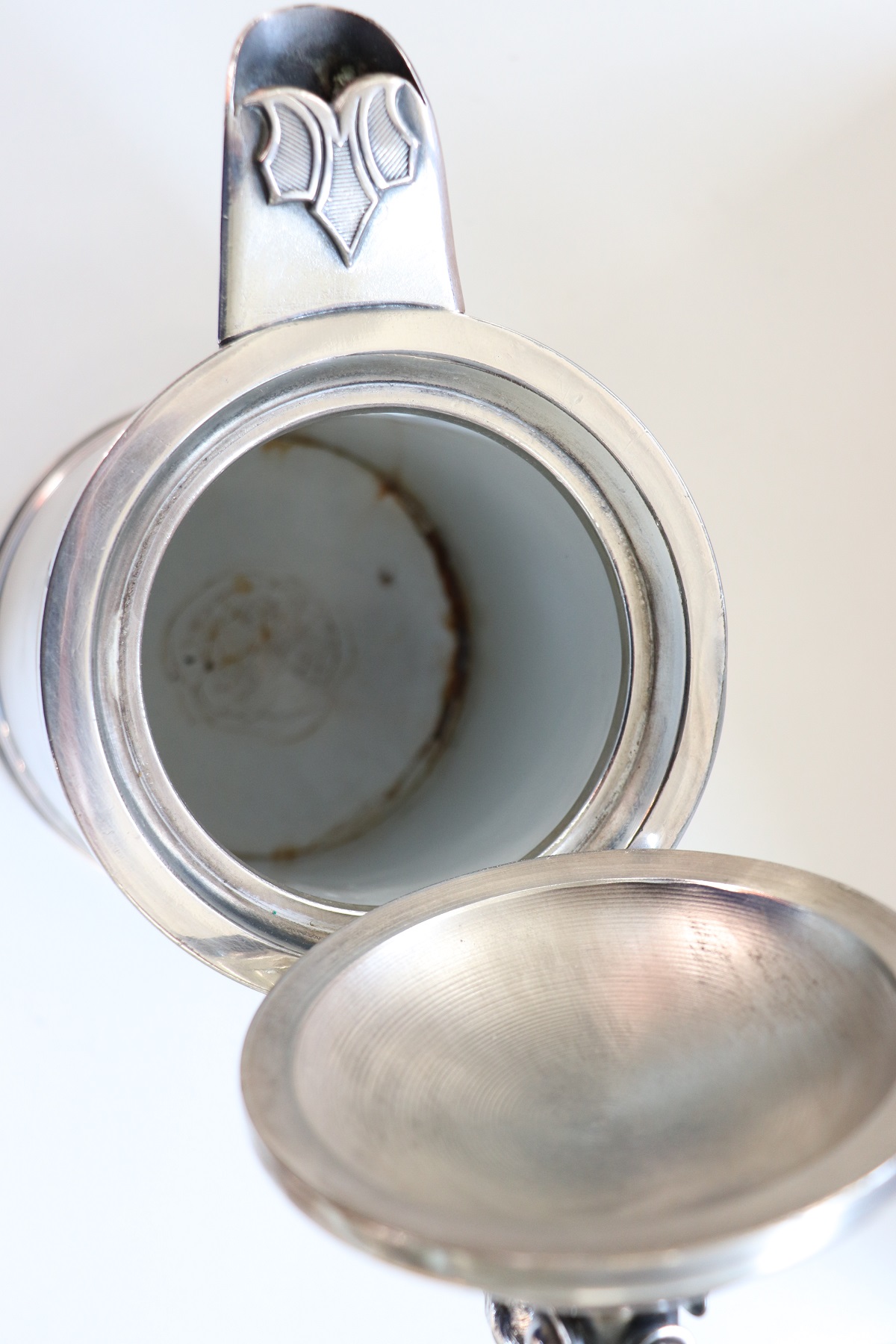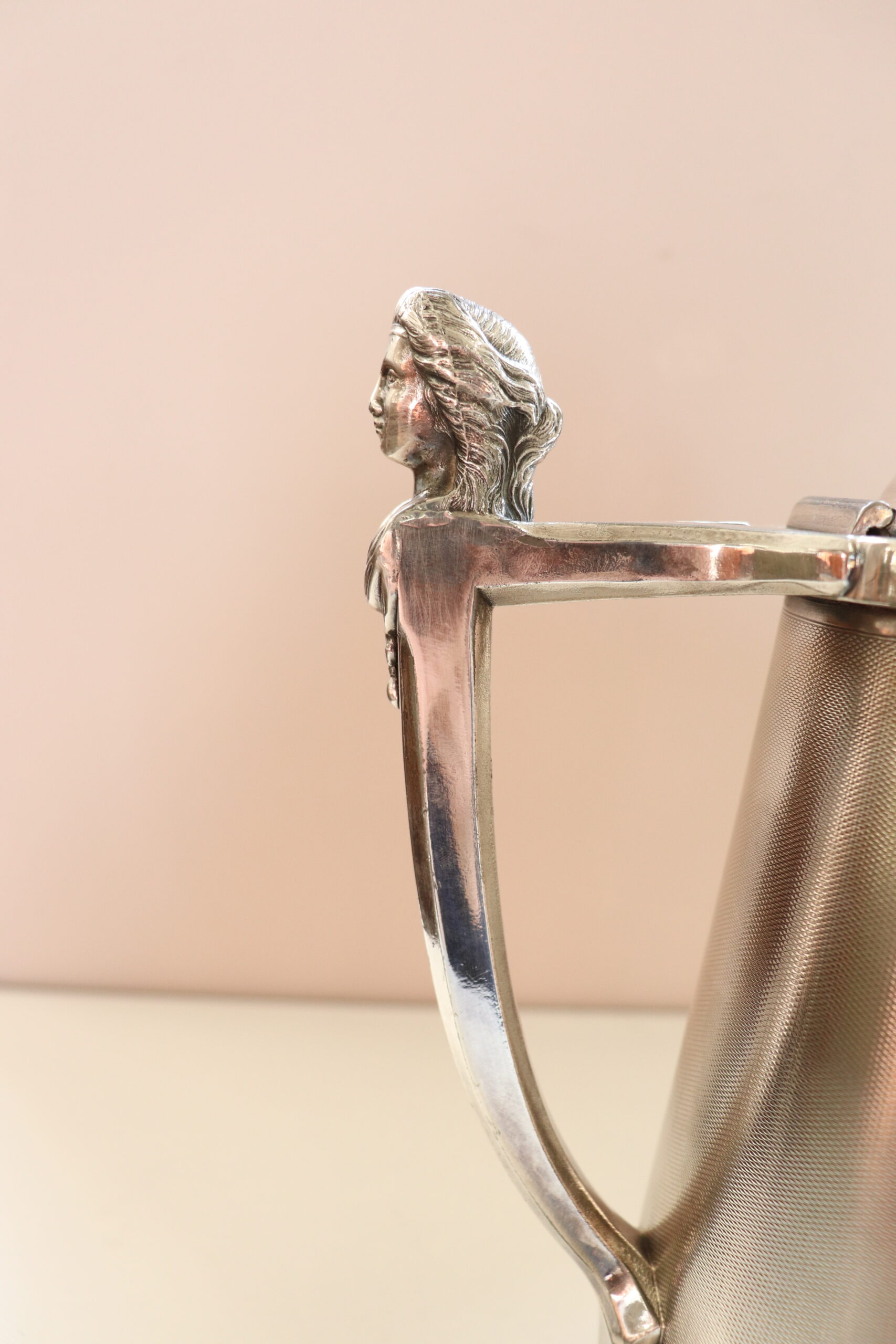 RAFFINATA GRANDE BROCCA IN METALLO CON ELEMENTI DECORATIVI DI GUSTO CLASSICO PLACCATA ARGENTO MANIFATTURA AMERICANA MARCHIO STIMPSON DATABILE INTORNO AL 1868. RAFFINATO OGGETTO DECORATIVO PER LA CASA