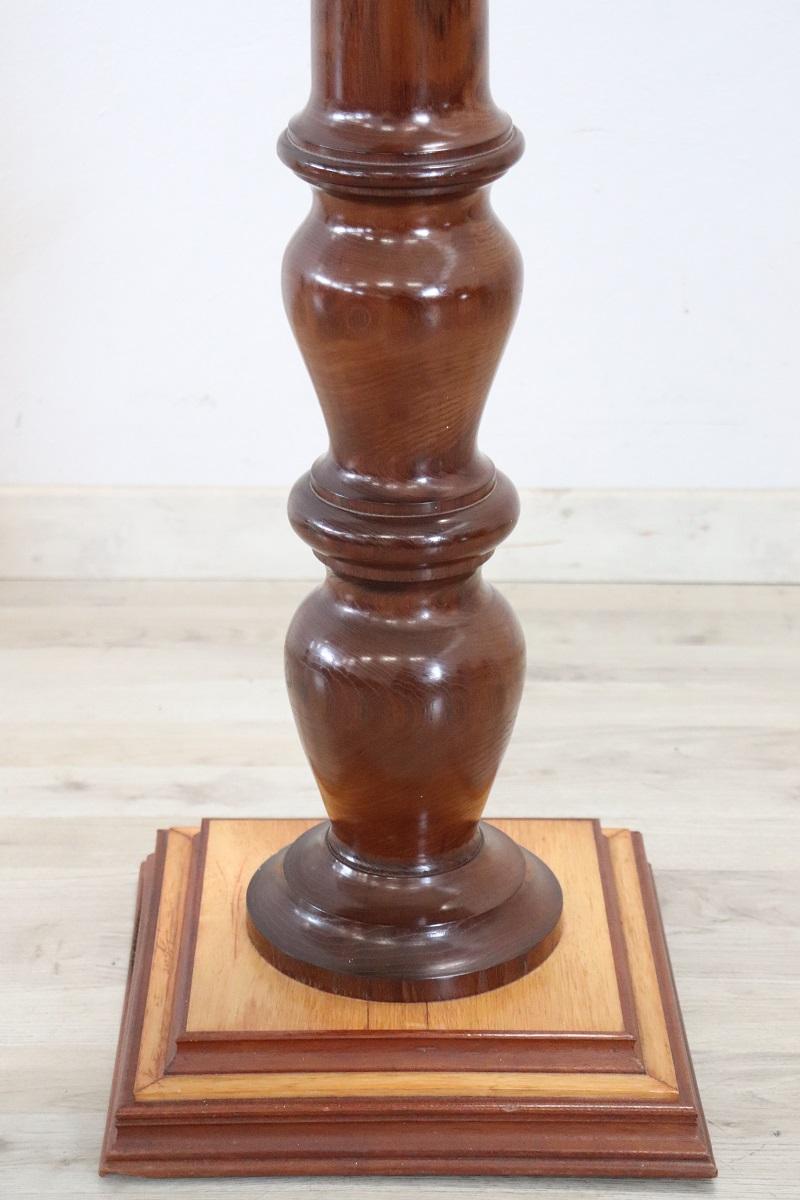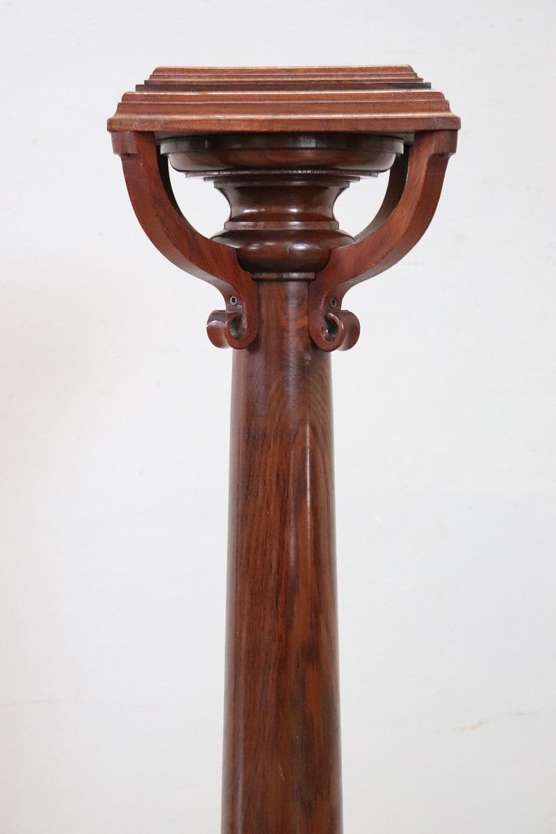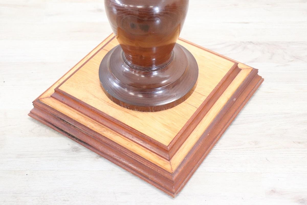 Colonna in rovere secolo XX. Questa splendida colonna, realizzata in Italia negli ultimi decenni del XX secolo, è una vera e propria testimonianza di maestria e artigianalità. Realizzata in legno massello di rovere, presenta un corpo elegantemente tornito che mette in risalto la bellezza del legno. I quattro riccioli decorativi non solo sostengono la base superiore di appoggio, ma aggiungono anche un tocco di eleganza al suo design, rendendola un pezzo notevole.