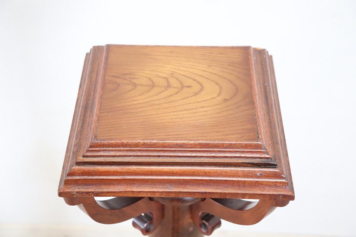 La finitura lucida del legno esalta le venature naturali, mettendo in risalto la consistenza e il colore del rovere. Questa colonna funge da base ideale per esporre una varietà di oggetti, sia che si tratti di una scultura in marmo o in bronzo, di un pezzo di ceramica da collezione o di un vivace vaso pieno di fiori.