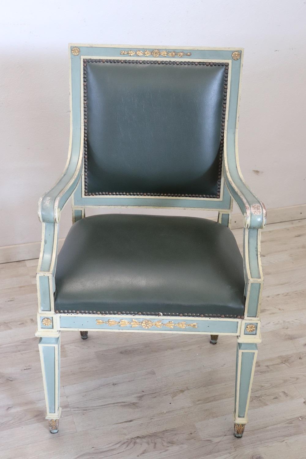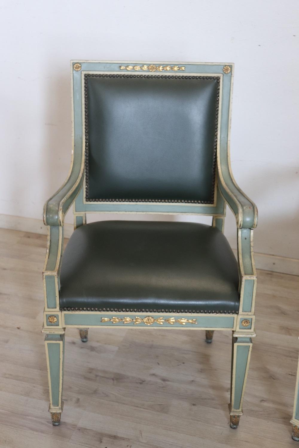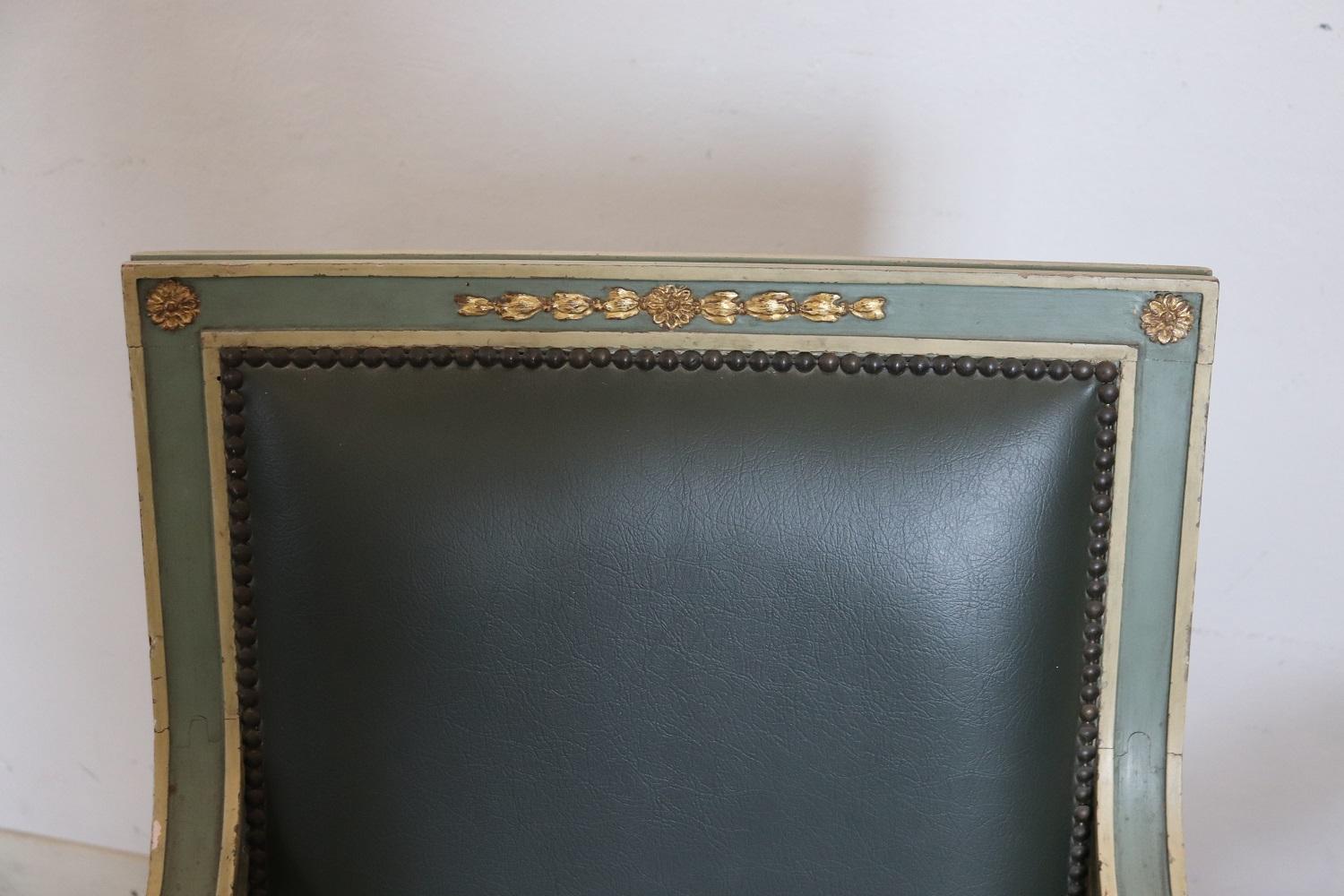 MISURE IN CM Altezza totale 97 Larghezza 57 Profondità 52 Altezza della seduta 50 – imballo professionale spedizioni assicurate con corrieri consegna su appuntamento solo piano strada no facchinaggio ai piani. DESCRIZIONE Grazioso set di 2 poltrone primi decenni secolo XX. Queste poltrone sono in stile Luigi XVI in legno laccato con raffinate decorazioni dorate. Rivestite in similpelle verde. Ottime condizioni di imbottitura e rivestimento si segnala segni di usura nella laccatura e fori di tarlo. Vi consigliamo comunque di guardare bene in dettaglio tutte le foto allegate. Proposte ad un’ottimo prezzo trattabile vi invitiamo ad inviarci le vostre proposte di acquisto le valuteremo con piacere.