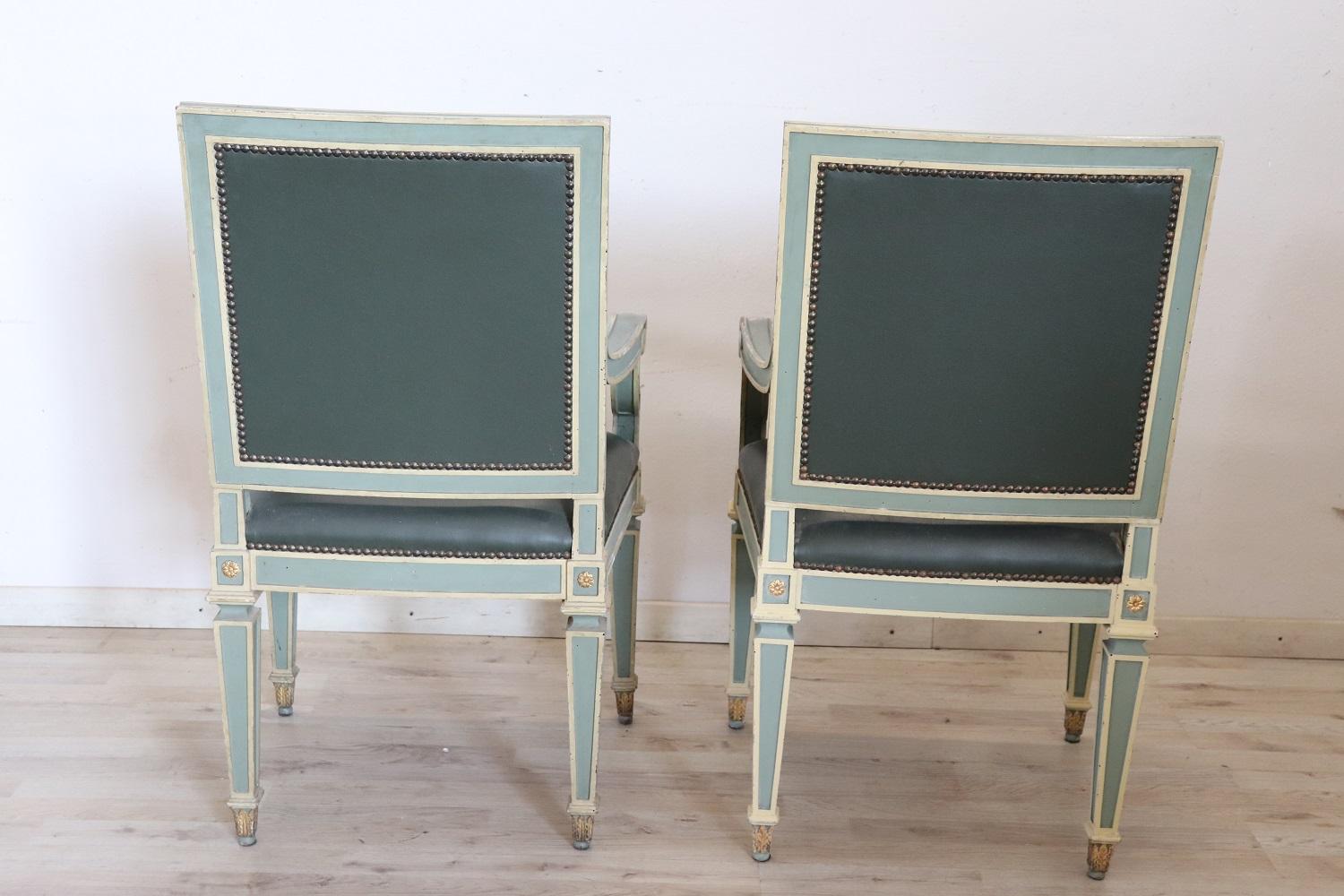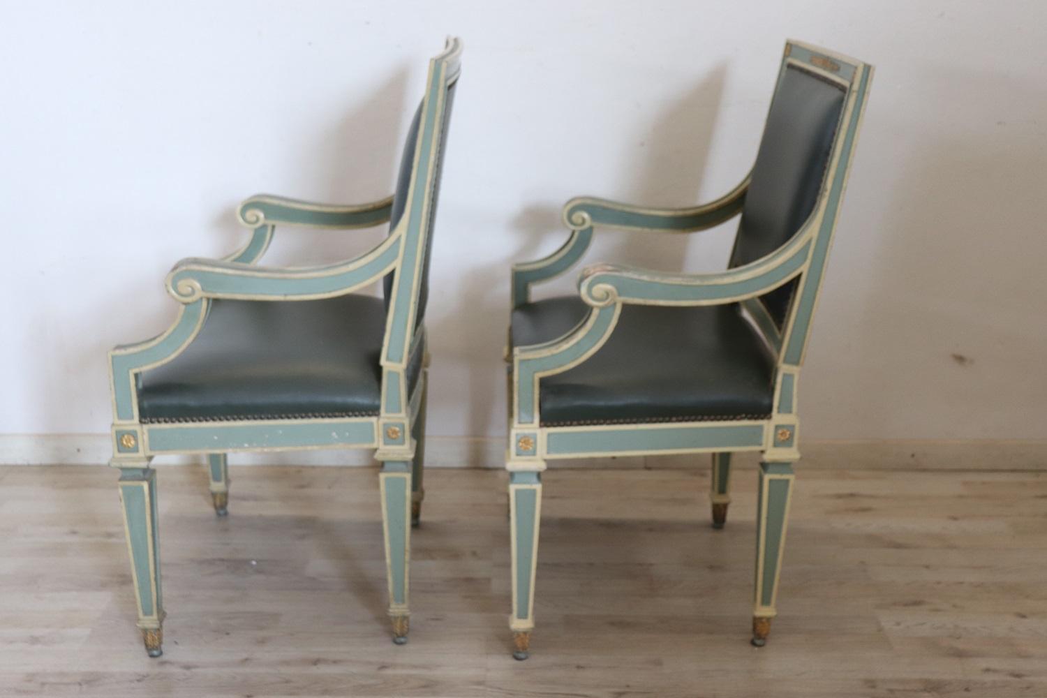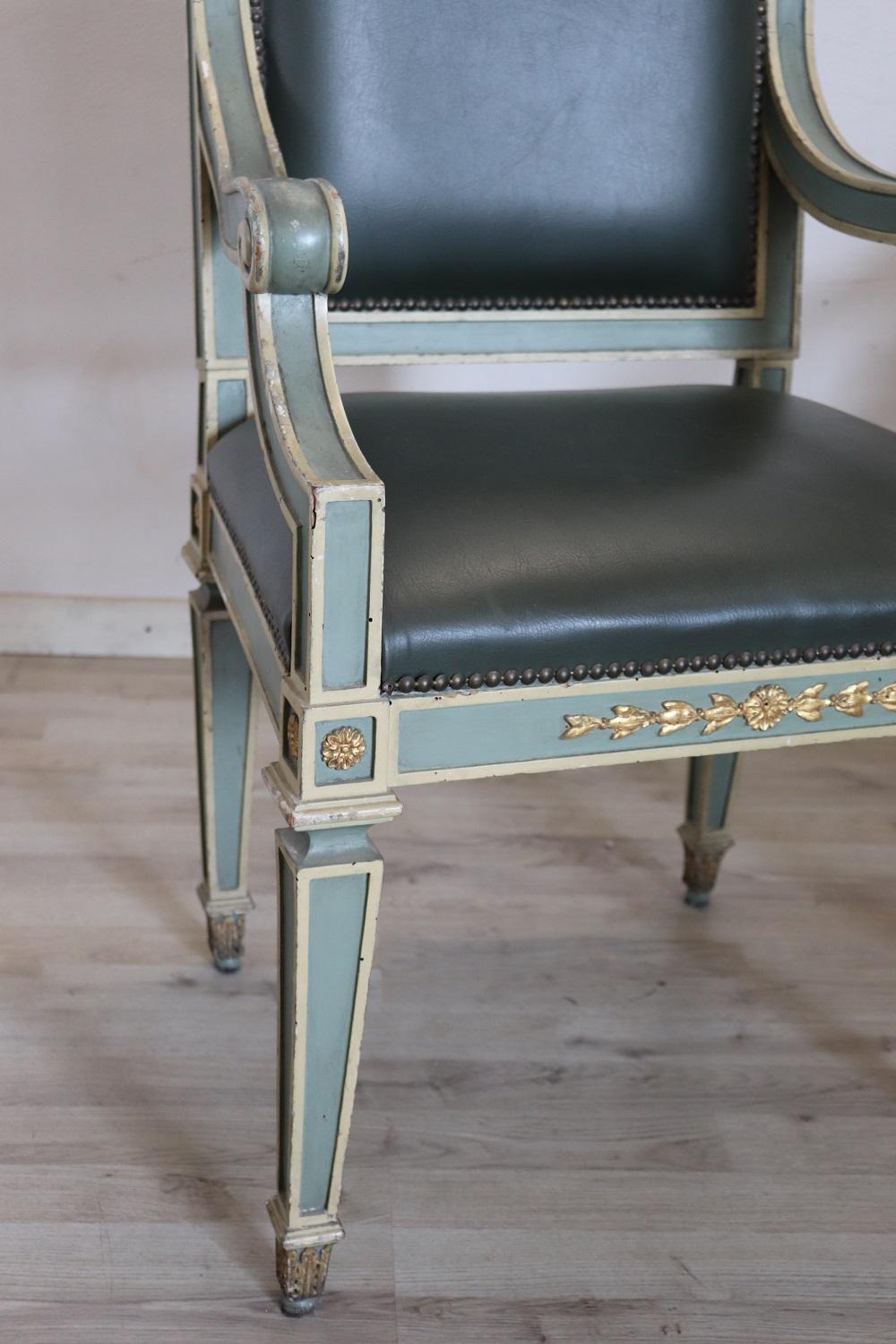 MISURE IN CM Altezza totale 97 Larghezza 57 Profondità 52 Altezza della seduta 50 – imballo professionale spedizioni assicurate con corrieri consegna su appuntamento solo piano strada no facchinaggio ai piani. DESCRIZIONE Grazioso set di 2 poltrone primi decenni secolo XX. Queste poltrone sono in stile Luigi XVI in legno laccato con raffinate decorazioni dorate. Rivestite in similpelle verde. Ottime condizioni di imbottitura e rivestimento si segnala segni di usura nella laccatura e fori di tarlo. Vi consigliamo comunque di guardare bene in dettaglio tutte le foto allegate. Proposte ad un’ottimo prezzo trattabile vi invitiamo ad inviarci le vostre proposte di acquisto le valuteremo con piacere.