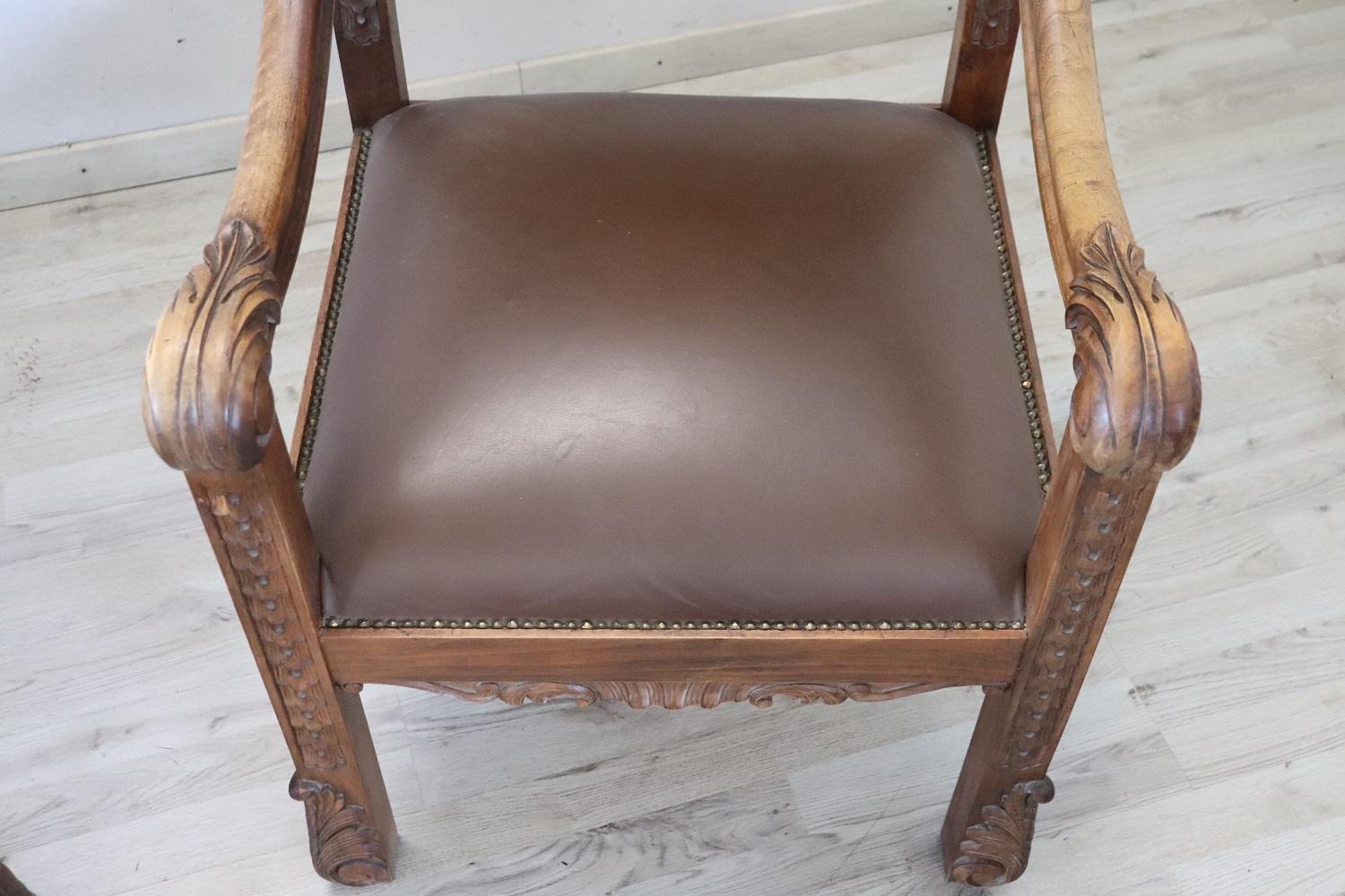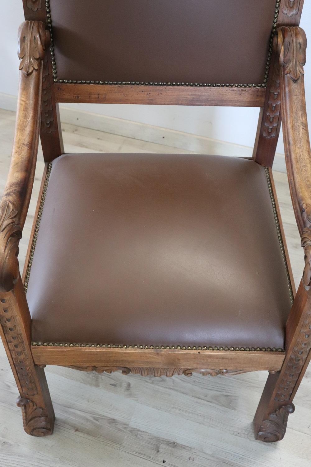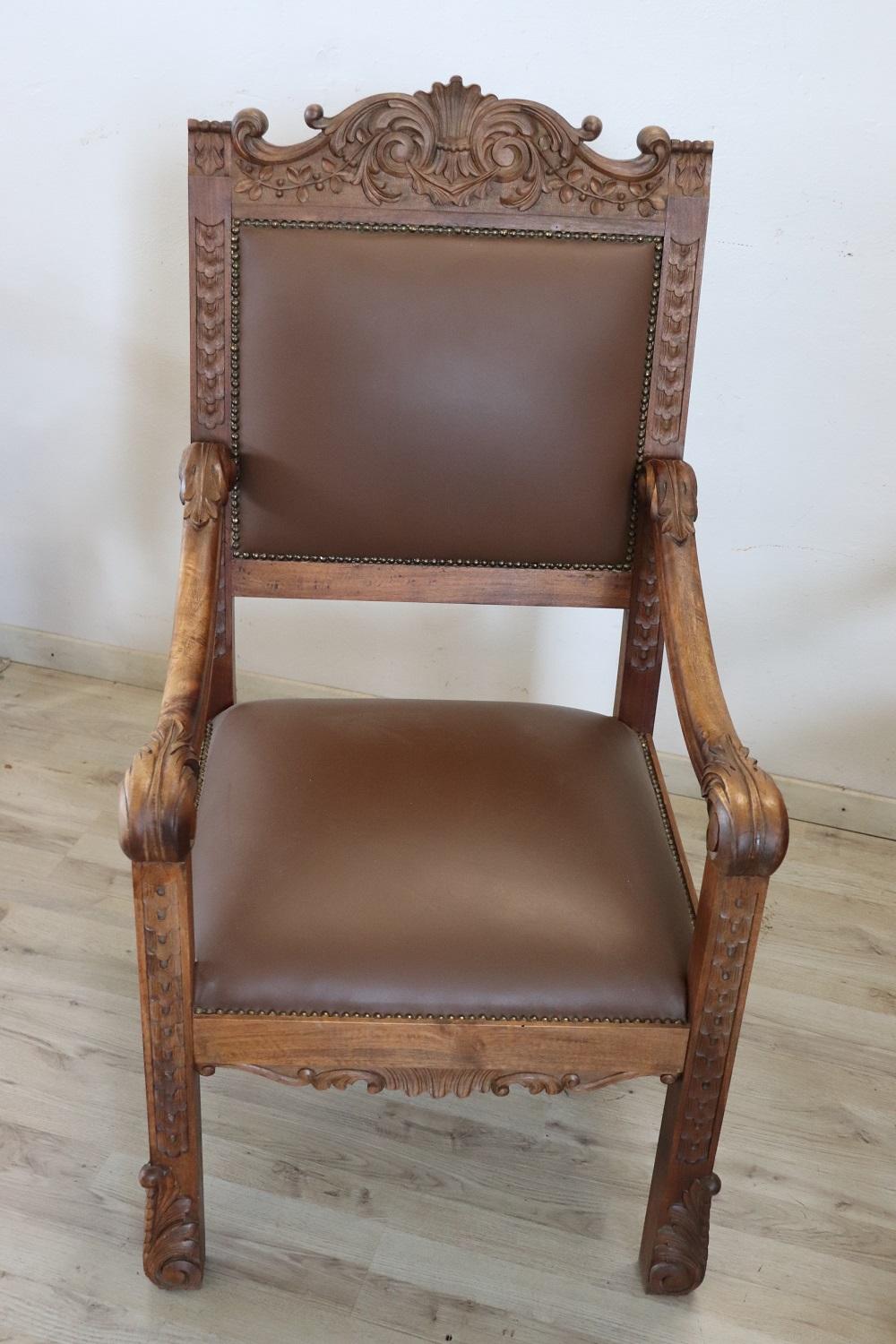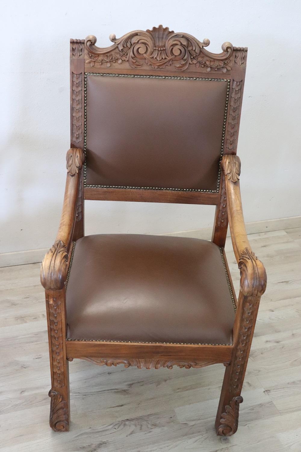 MISURE IN CM Altezza totale 119 Larghezza 62 Profondità 69 Altezza della seduta 50 – imballo professionale spedizioni assicurate con corrieri consegna su appuntamento solo piano strada no facchinaggio ai piani. DESCRIZIONE Coppia di poltrone a trono in perfetto stile rinascimentale italiano, fine secolo XIX secolo. Realizzate in legno massello di noce. Lo schienale in legno finemente intagliato presenta una decorazione molto complessa. Si noti come la decorazione intagliata nel legno sia presente anche al retro dello schienale dei due troni, bellissimi da ammirare da ogni lato. Lo schienale e la seduta sono imbottiti e rivestiti in ecopelle marrone impreziosita da borchie in ottone dorato. Usate ma in ottime condizioni sia del legno che dell’imbottitura e della finta pelle. Pronte per essere utilizzato e ammirato nella vostra bella casa. Perfette per essere utilizzate come capotavola o in un salotto. Vi consigliamo comunque di guardare bene in dettaglio tutte le foto allegate. Proposte ad un’ottimo prezzo trattabile vi invitiamo ad inviarci le vostre proposte di acquisto le valuteremo con piacere.