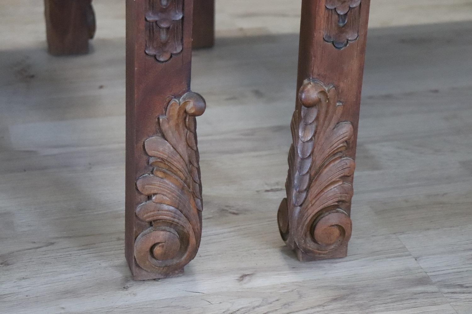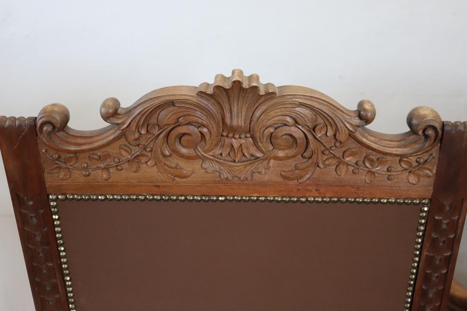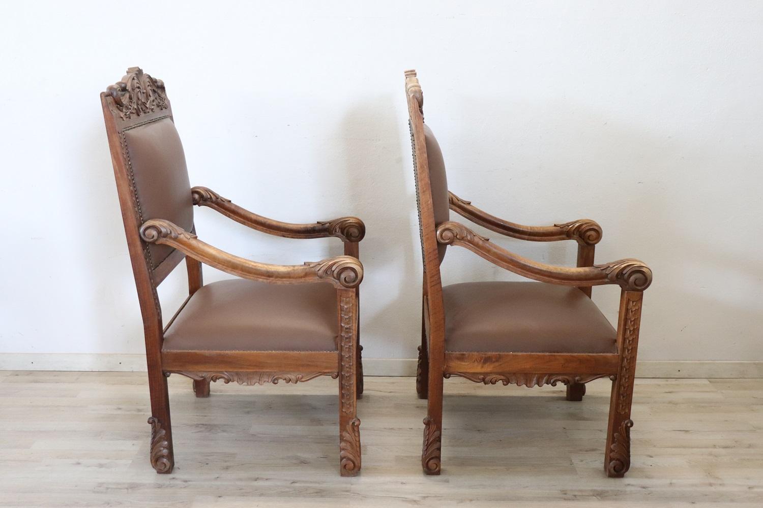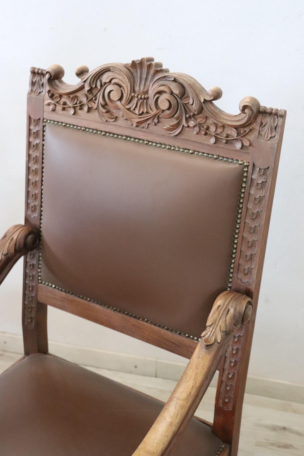 MISURE IN CM Altezza totale 119 Larghezza 62 Profondità 69 Altezza della seduta 50 – imballo professionale spedizioni assicurate con corrieri consegna su appuntamento solo piano strada no facchinaggio ai piani. DESCRIZIONE Coppia di poltrone a trono in perfetto stile rinascimentale italiano, fine secolo XIX secolo. Realizzate in legno massello di noce. Lo schienale in legno finemente intagliato presenta una decorazione molto complessa. Si noti come la decorazione intagliata nel legno sia presente anche al retro dello schienale dei due troni, bellissimi da ammirare da ogni lato. Lo schienale e la seduta sono imbottiti e rivestiti in ecopelle marrone impreziosita da borchie in ottone dorato. Usate ma in ottime condizioni sia del legno che dell’imbottitura e della finta pelle. Pronte per essere utilizzato e ammirato nella vostra bella casa. Perfette per essere utilizzate come capotavola o in un salotto. Vi consigliamo comunque di guardare bene in dettaglio tutte le foto allegate. Proposte ad un’ottimo prezzo trattabile vi invitiamo ad inviarci le vostre proposte di acquisto le valuteremo con piacere.