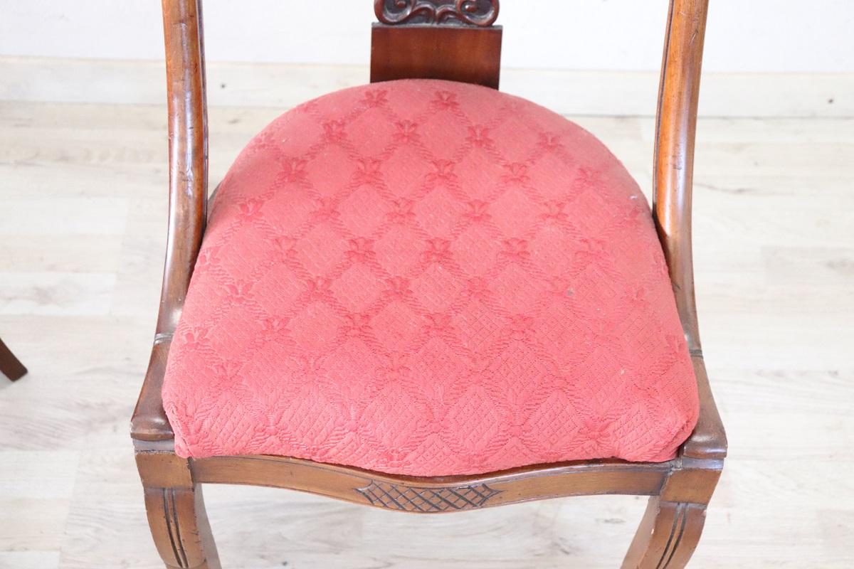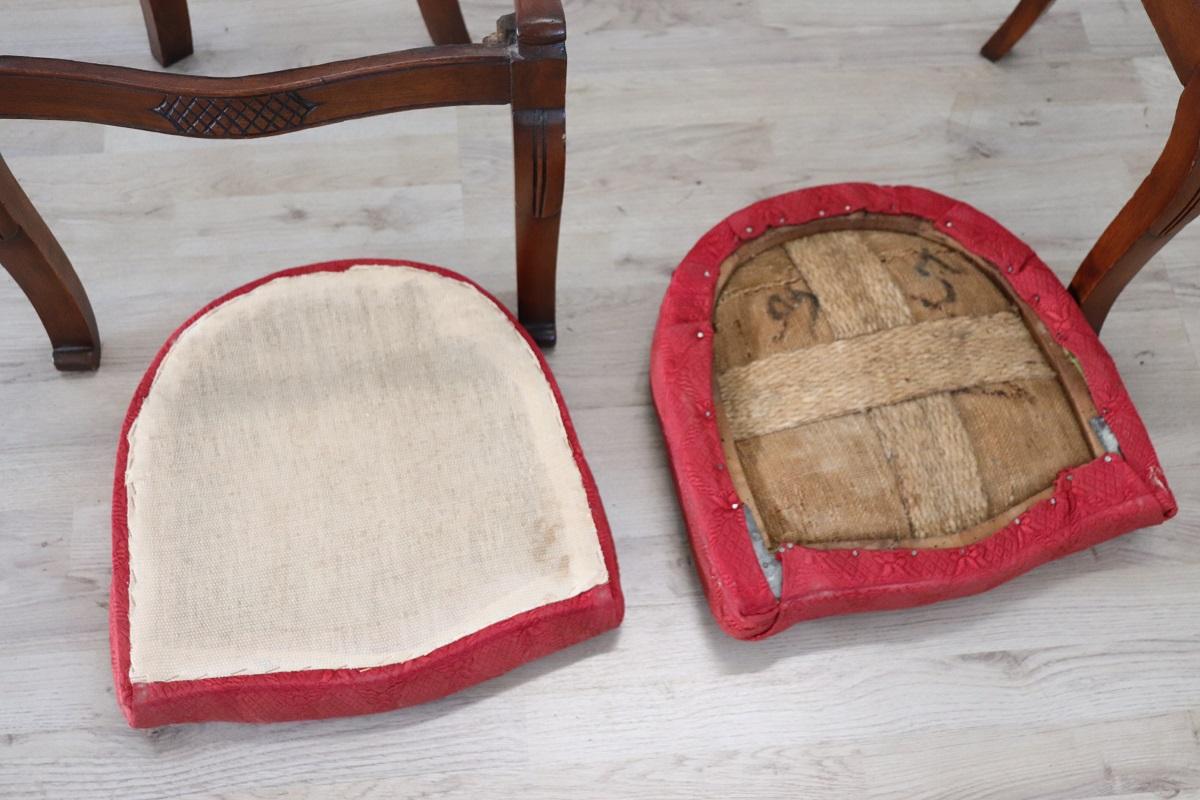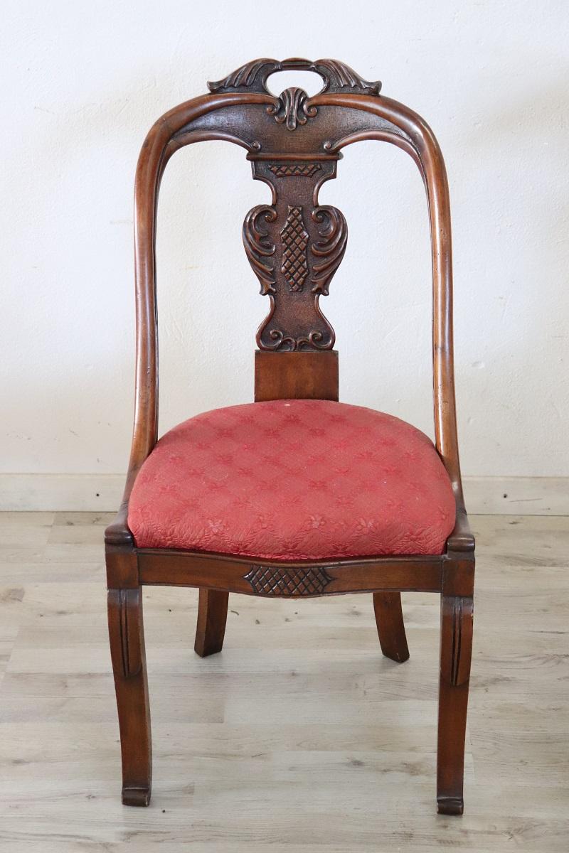 Coppia di sedie antiche in noce intagliato epoca Carlo X. Bellissimo set di due sedie antiche in legno di noce massello prima metà del XIX secolo periodo Carlo X ebanisteria italiana. Caratterizzate da uno schienale avvolgente e raffinato, impreziosito da un’elaborata decorazione intagliata a mano nel legno di noce. La seduta è ampia e confortevole con imbottitura rivestita in elegante tessuto rosso. Ottime condizioni del legno leggera usura del tessuto e dell’imbottitura, si consiglia sostituzione. Prezzo trattabile vi invitiamo ad inviarci le vostre proposte di acquisto le valuteremo con piacere. Vi consigliamo comunque di guardare bene in dettaglio tutte le foto allegate.