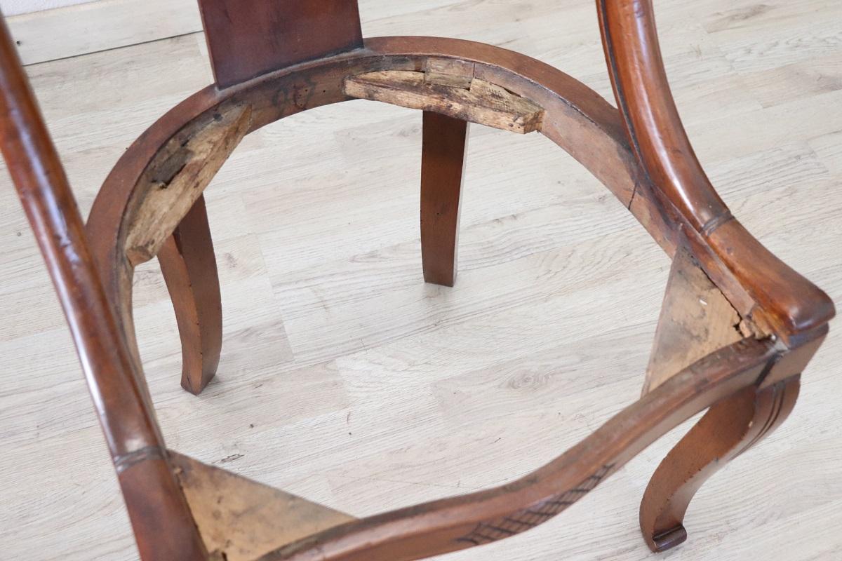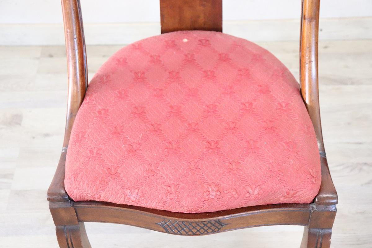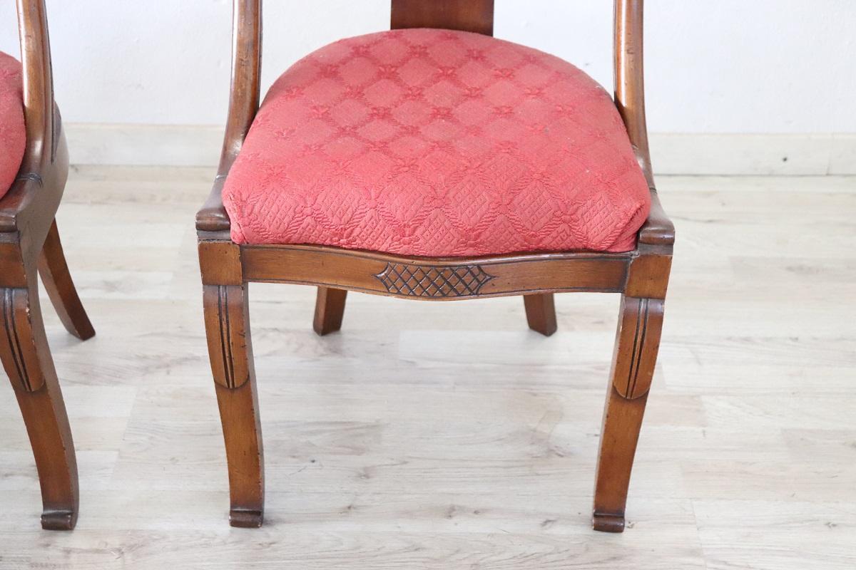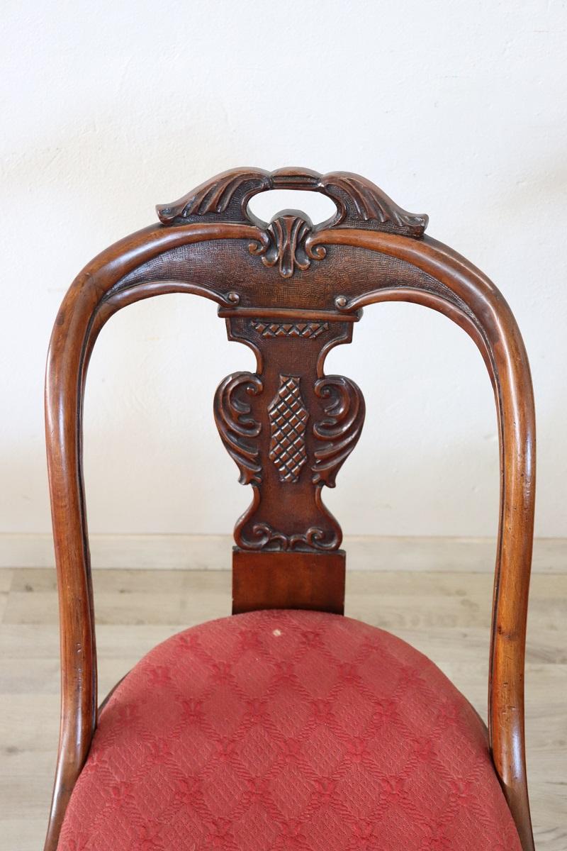 Coppia di sedie antiche in noce intagliato epoca Carlo X. Bellissimo set di due sedie antiche in legno di noce massello prima metà del XIX secolo periodo Carlo X ebanisteria italiana. Caratterizzate da uno schienale avvolgente e raffinato, impreziosito da un’elaborata decorazione intagliata a mano nel legno di noce. La seduta è ampia e confortevole con imbottitura rivestita in elegante tessuto rosso. Ottime condizioni del legno leggera usura del tessuto e dell’imbottitura, si consiglia sostituzione. Prezzo trattabile vi invitiamo ad inviarci le vostre proposte di acquisto le valuteremo con piacere. Vi consigliamo comunque di guardare bene in dettaglio tutte le foto allegate.