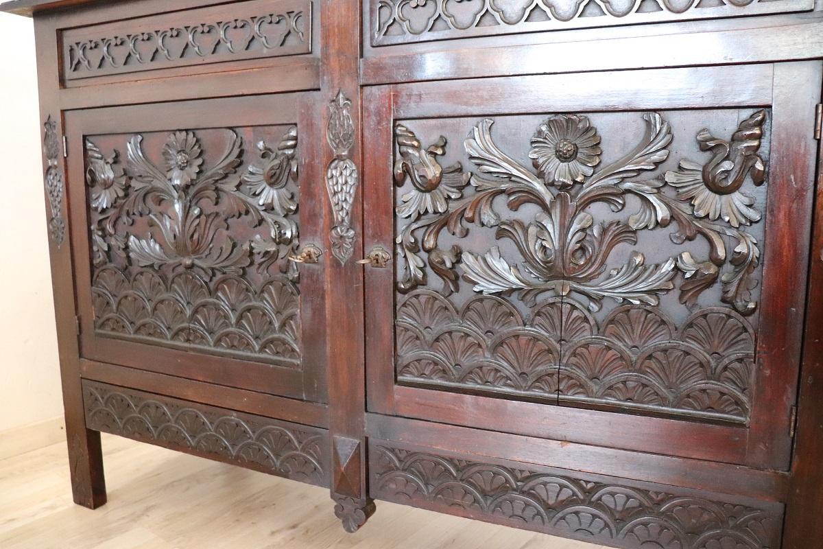 Credenza epoca liberty in faggio. Questa credenza in legno di faggio, risalente ai primi del Novecento, rappresenta un autentico capolavoro di artigianato senza tempo. Gli intricati decori floreali sulle ante catturano immediatamente l’attenzione, testimonianza dell’eccezionale abilità artigianale che ha caratterizzato la sua creazione. La tonalità calda e profonda del legno di faggio ne esalta l’eleganza, rendendola un pezzo di spicco, perfetto per ambienti ben illuminati dove i dettagli possono essere apprezzati in tutto il loro splendore.