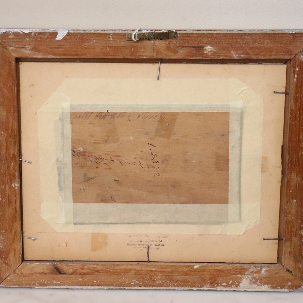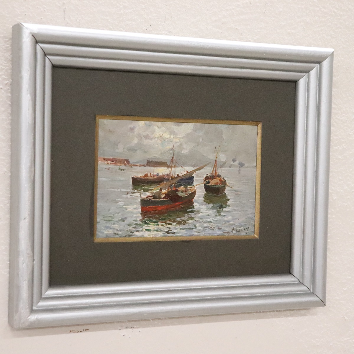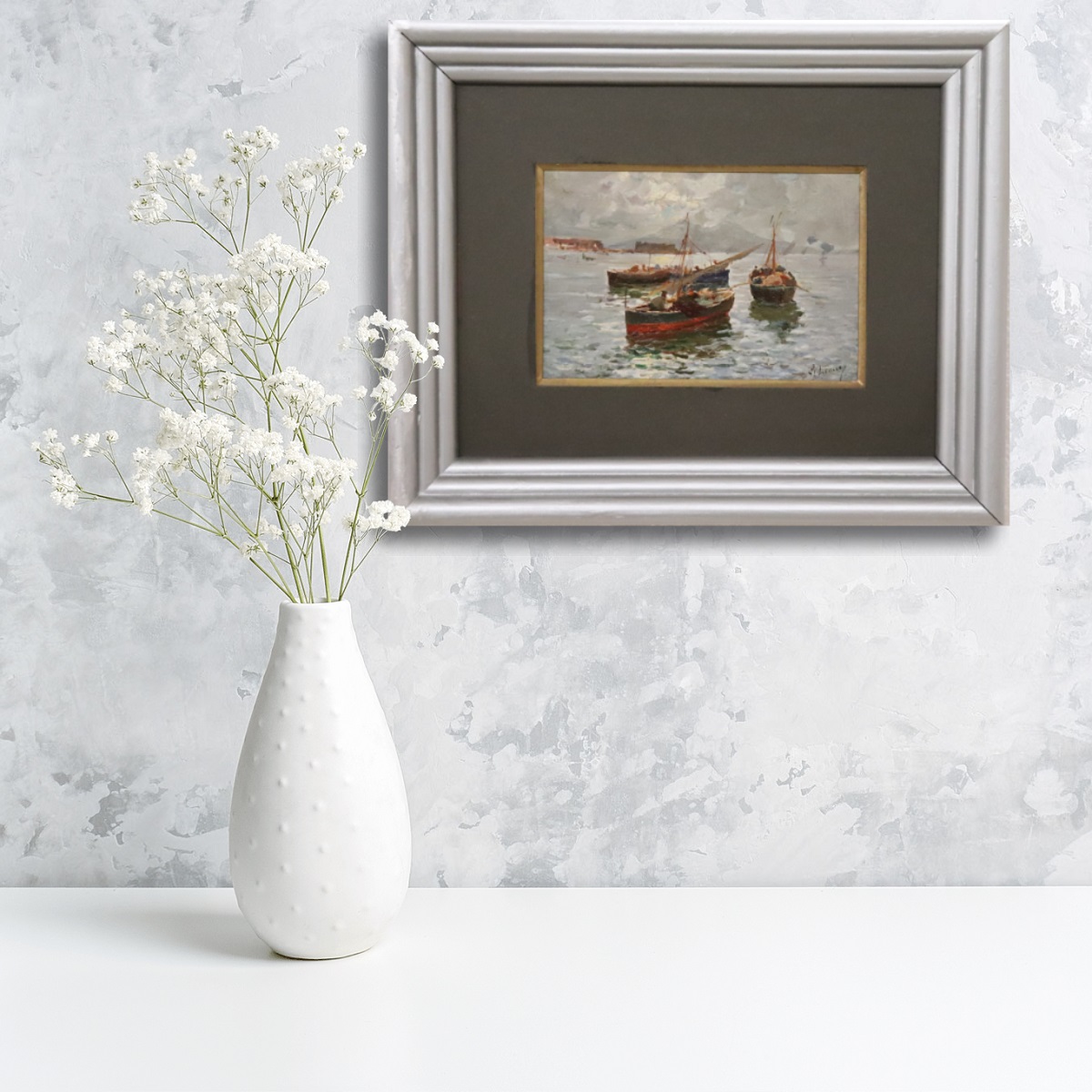 Questo piccolo dipinto cattura il fascino della costa italiana nella città di Napoli. L’imponente sagoma di Castel dell’Ovo che si erge dal mare è chiaramente visibile sulla sinistra, mentre il Vesuvio imponente si vede sullo sfondo. I veri protagonisti di questo dipinto sono i pescatori e le loro barche in primo piano. Il dipinto è caratterizzato da pennellate decise e materiche che mettono in risalto le qualità artistiche dell’artista. L’artista cattura in maniera molto personale l’atmosfera del golfo che incontra le attività di vita quotidiana legate al mare. Se conoscete Napoli e il suo golfo, rimarrete affascinati da questo dipinto, tanto da sentirvi trasportati dai profumi e dai suoni del mare e dei suoi pescatori.