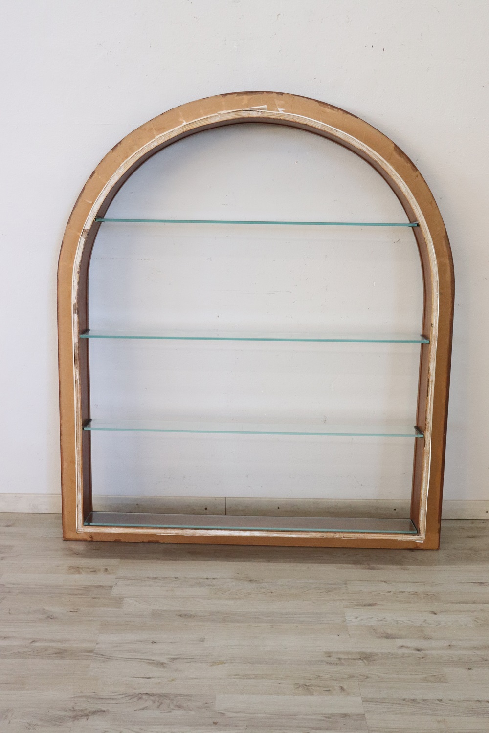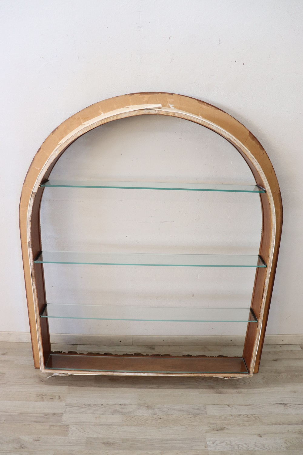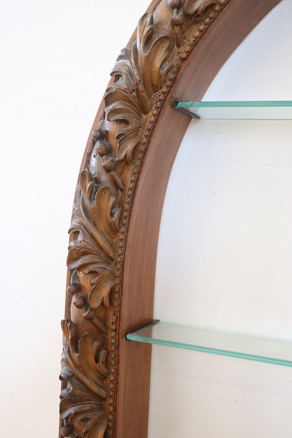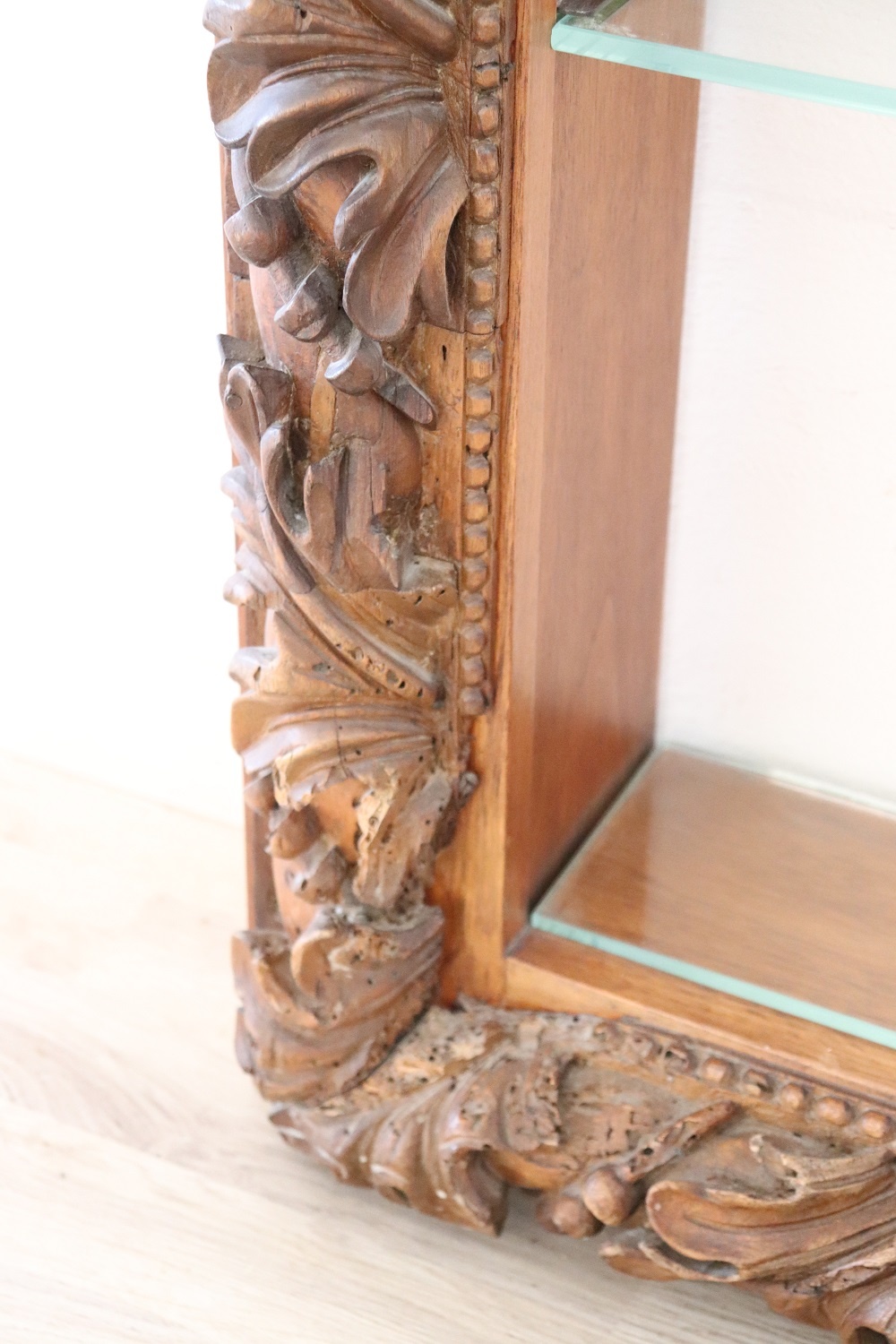 Bellissima particolare grande etagere realizzata in legno di noce con cornice finemente scolpita con decorazione a foglie d’acanto. Databile verso gli ultimi decenni del secolo XIX. Dotata di tre ripiani in vetro perfetta per l’esposizione di piccoli oggetti da collezione. La cornice è stata realizzata per essere posata ad incasso nel muro. Buone condizioni generali da segnalare la presenza diffusa di fori da tarlo infestazione attualmente non più attiva. Vi consigliamo di guardare bene in dettaglio tutte le foto allegate. Proposta ad un’ottimo prezzo trattabile vi invitiamo ad inviarci le vostre proposte di acquisto le valuteremo con piacere.