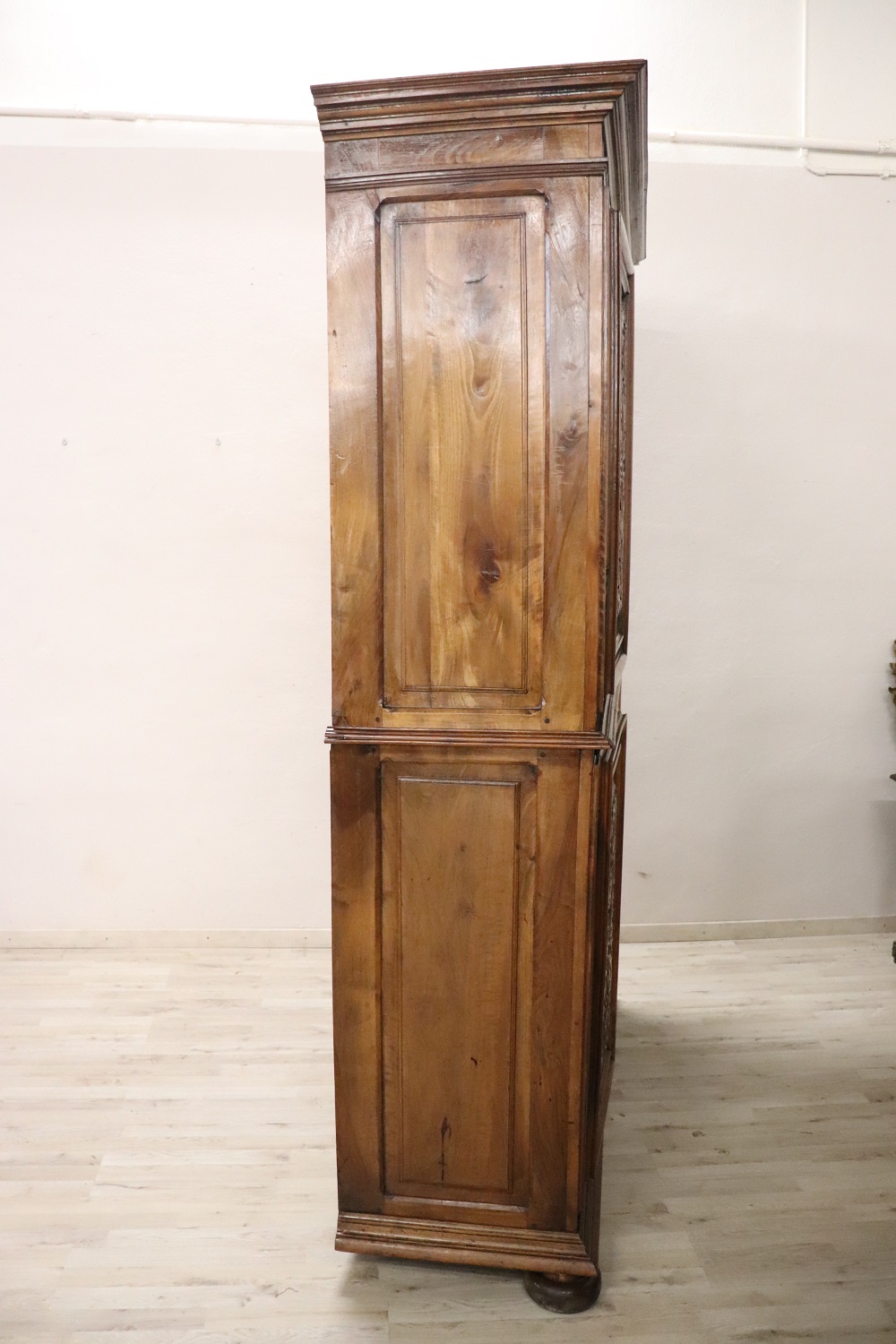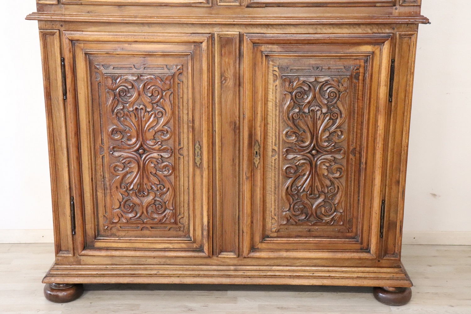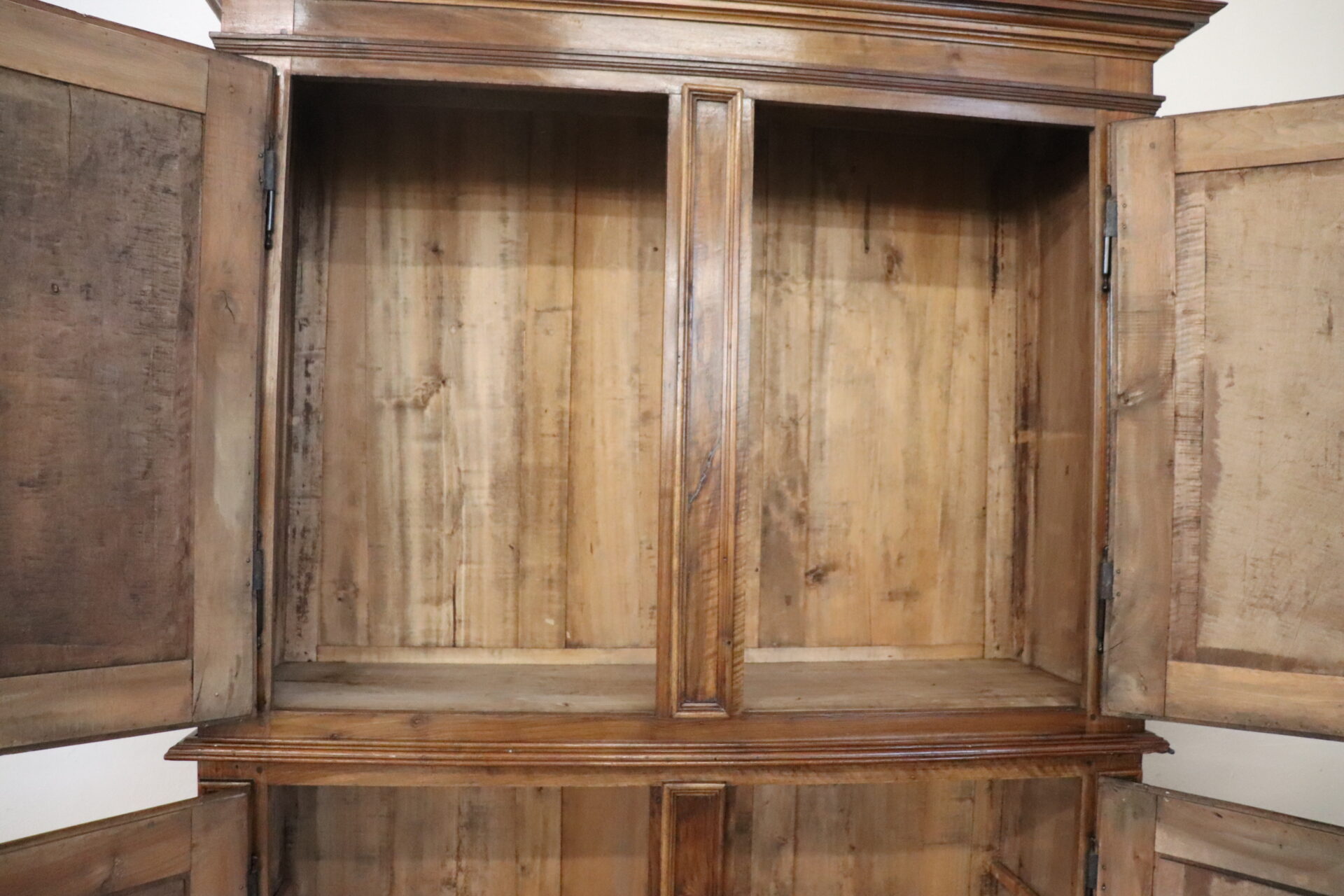 Maestoso armadio antico o dispensa seconda metà del secolo XIX realizzato in noce massello. L’armadio a due corpi è caratterizzato da ante frontali con raffinato ed elaborato decoro scolpito nel legno. Internamente mancano i ripiani è possibile aggiungeri a piacere, questa tipologia di armadi nascevano per essere utilizzati come grandi dispense. Armadio di grande fascino. L’armadio ha una costruzione a due corpi che facilita il movimento. Arredi di questa importanza erano commissionati solo da famiglie di alta classe sociale. Ottime condizioni antiche bella patina del legno di noce. Vi consigliamo comunque di guardare bene in dettaglio tutte le foto allegate. Proposta ad un’ottimo prezzo trattabile vi invitiamo ad inviarci le vostre proposte di acquisto le valuteremo con piacere.