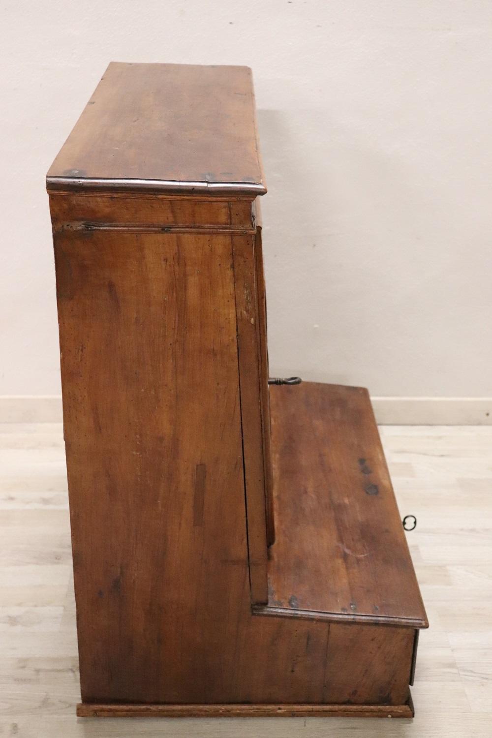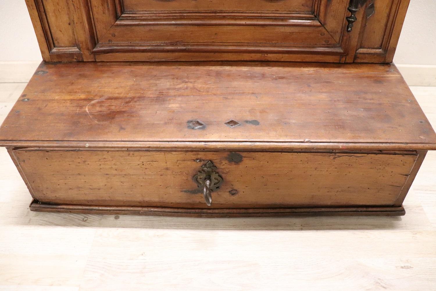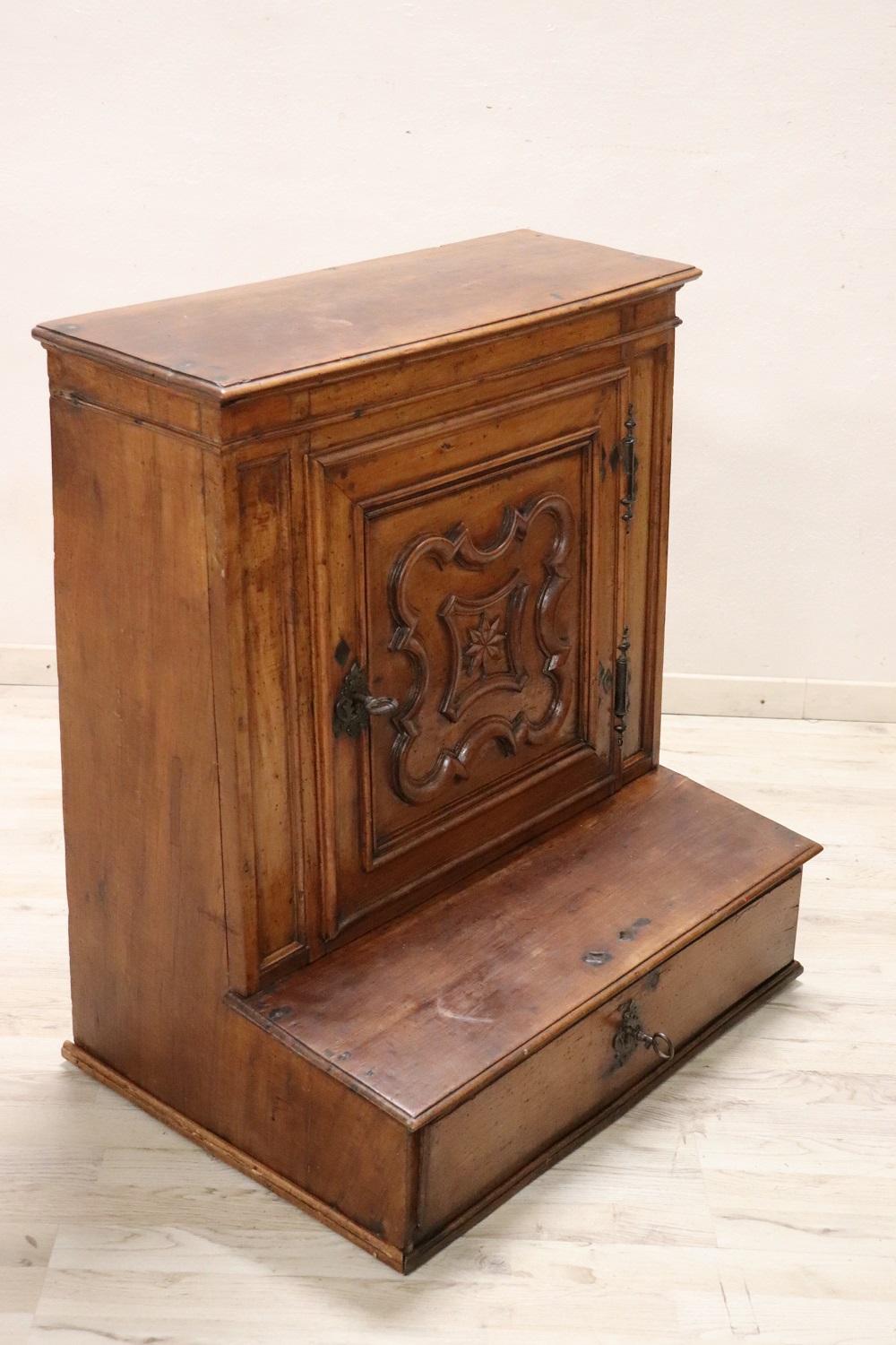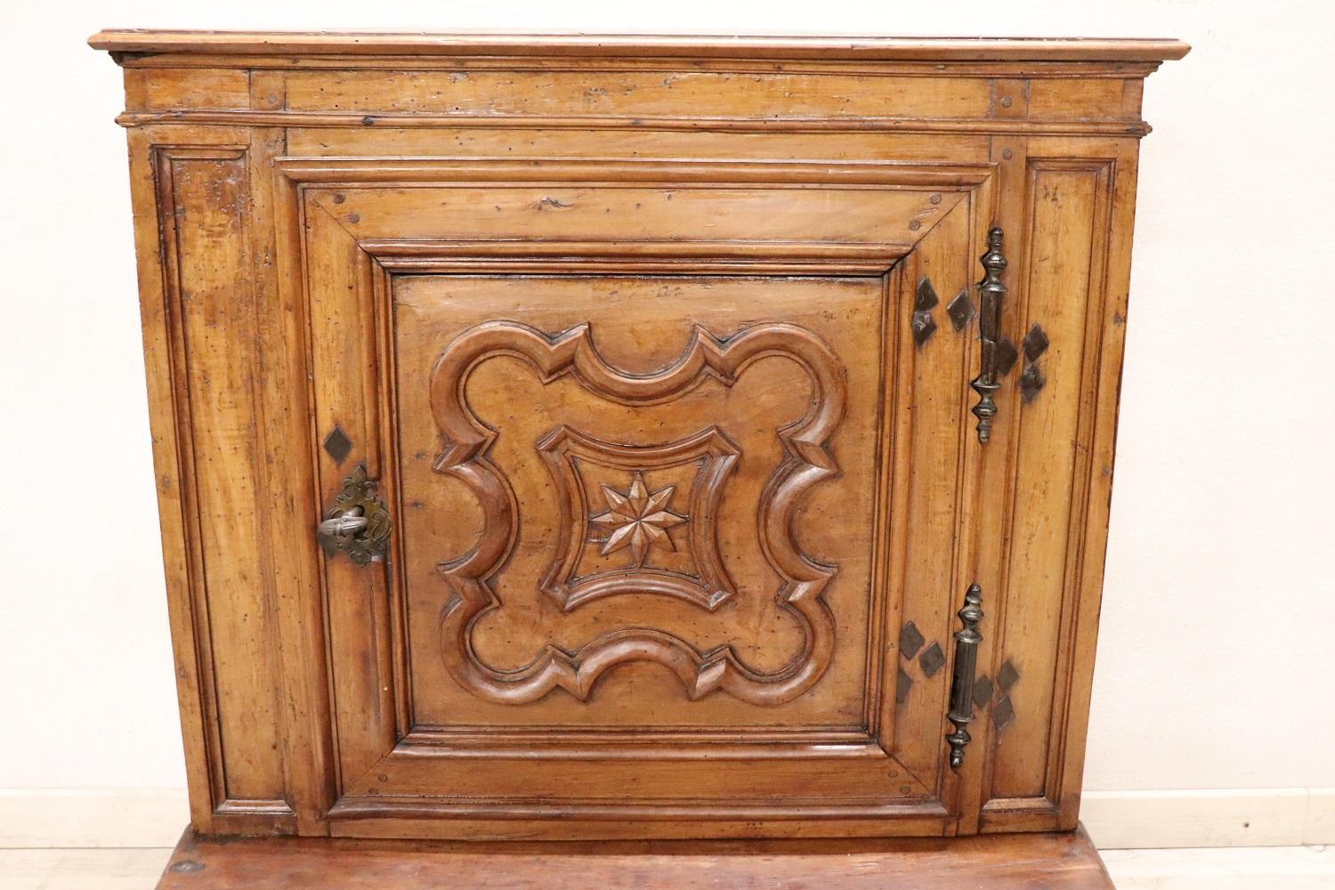 Raro inginocchiatoio italiano antico, metà del XVII secolo piena epoca barocca Luigi XIV. Realizzato in noce massiccio con decorazioni a rilievo intagliate nel legno sul pannello frontale. Di chiaro gusto ebanisteria barocca piemontese. Nella parte dedicata alle ginocchia è presente un vano. Di grande valore tutta la ferramenta in ferro forgiato a mano e coeva, fantastiche grandi chiavi antiche del XVII secolo. Ottimo stato di conservazione. Questo fantastico inginocchiatoio è un pezzo di storia che potrebbe essere esposto in un museo. Questo bellissimo arredo antico trova collocazione facile per le sue piccole dimensioni e può essere utilizzato per le vostre preghiere quotidiane o semplicemente com particolare complemento di arredo. Ottime condizioni vi consigliamo comunque di guardare bene in dettaglio tutte le foto allegate. Proposta ad un’ottimo prezzo trattabile vi invitiamo ad inviarci le vostre proposte di acquisto le valuteremo con piacere.