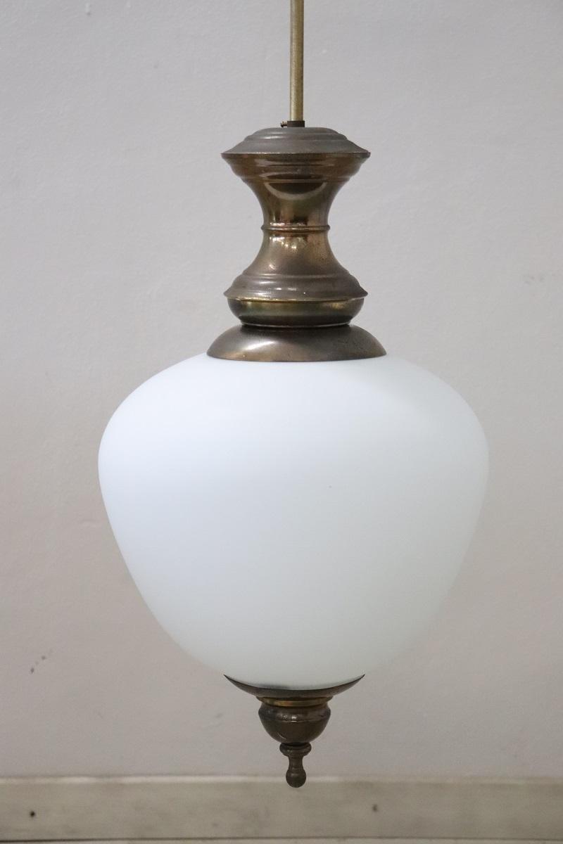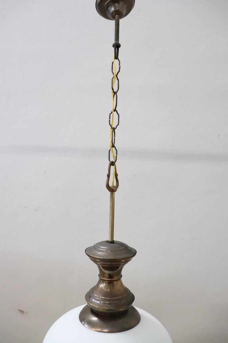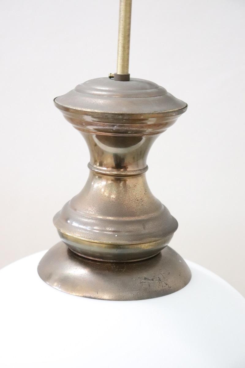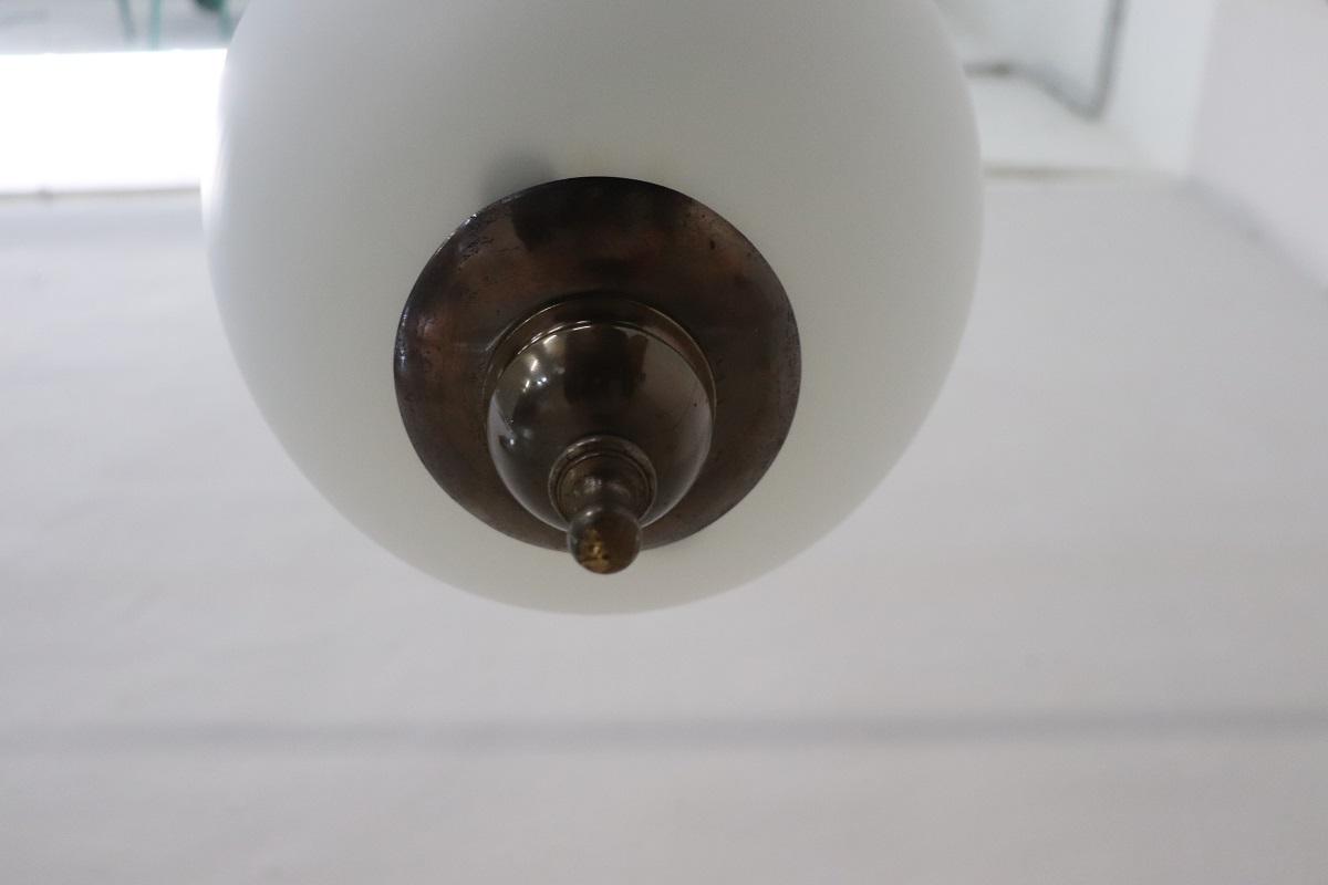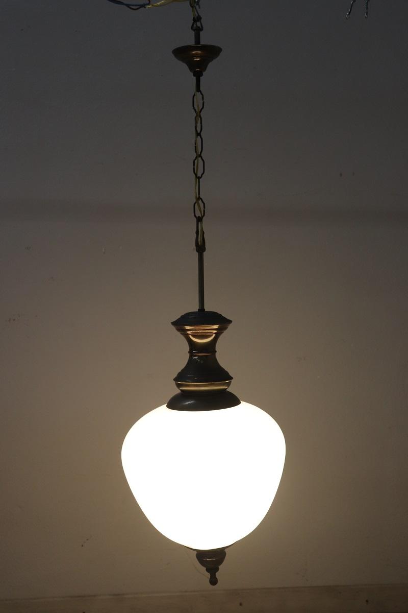 Vi presentiamo una splendida lampada a sospensione produzione italiana risalente agli anni ’60 circa. Questo squisito pezzo presenta una splendida struttura in ottone patinato abbinata a un’elegante boccia in vetro opalino, che ne esalta l’estetica. La lampada è progettata per ospitare una lampadina interna, garantendo una luce calda e invitante.