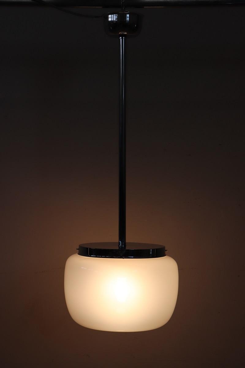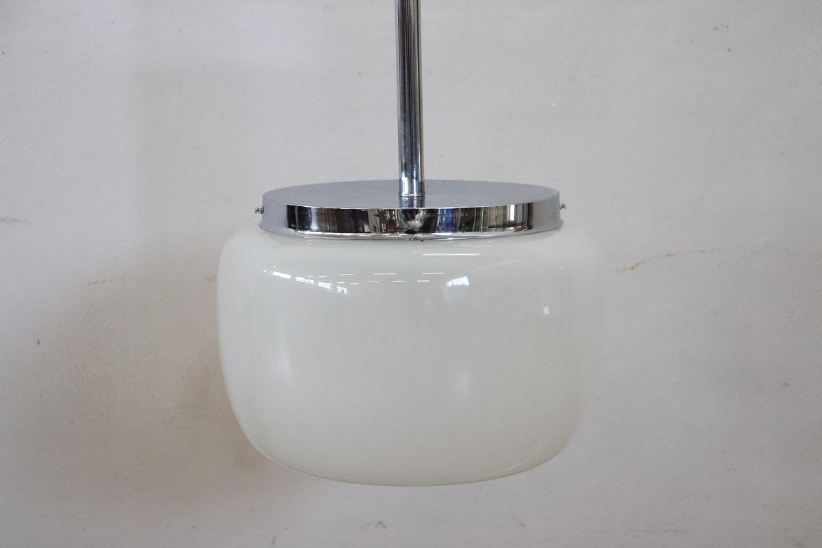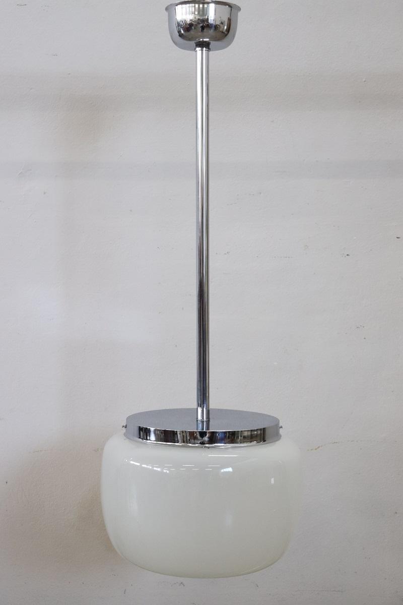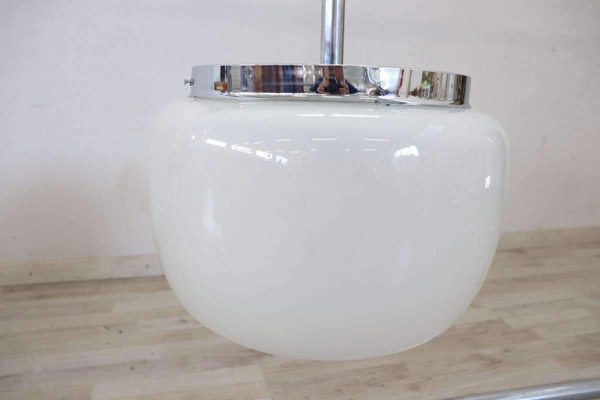 Lampada a sospensione in vetro e metallo cromato anni ’60. Bellissima e raffinata lampada a sospensione design italiano in vetro opalino bianco e metallo cromato, anni ’60. Una lampadina interna. Perfettamente funzionante. Proposta ad un prezzo trattabile vi invitiamo ad inviarci le vostre proposte di acquisto le valuteremo con piacere. Vi consigliamo di guardare bene in dettaglio tutte le foto allegate.