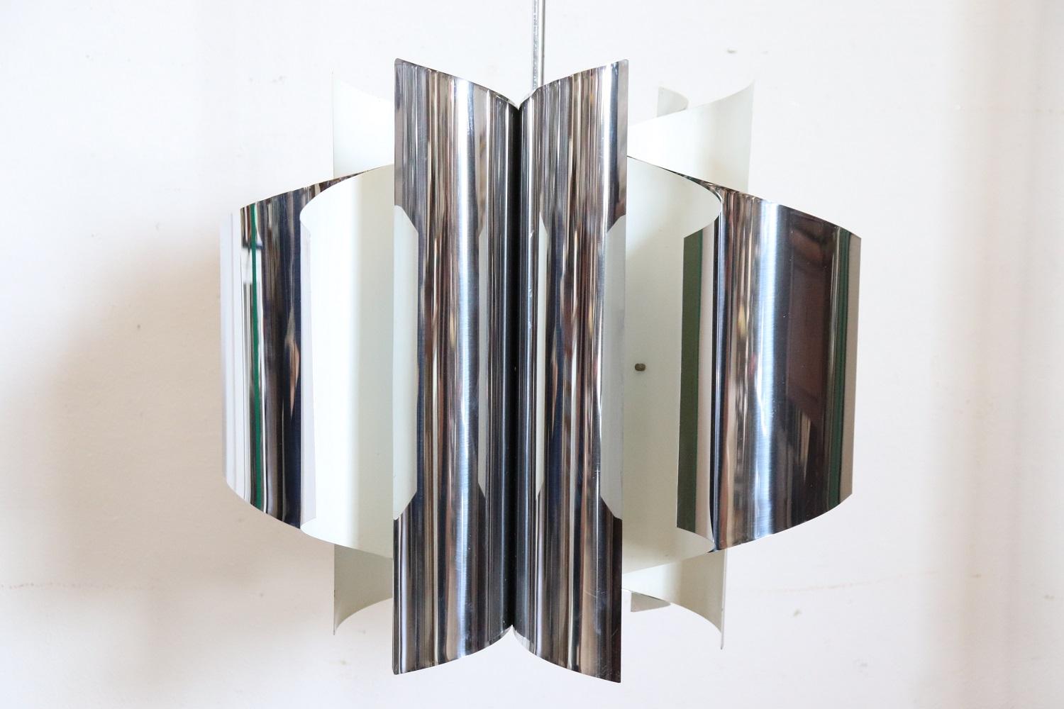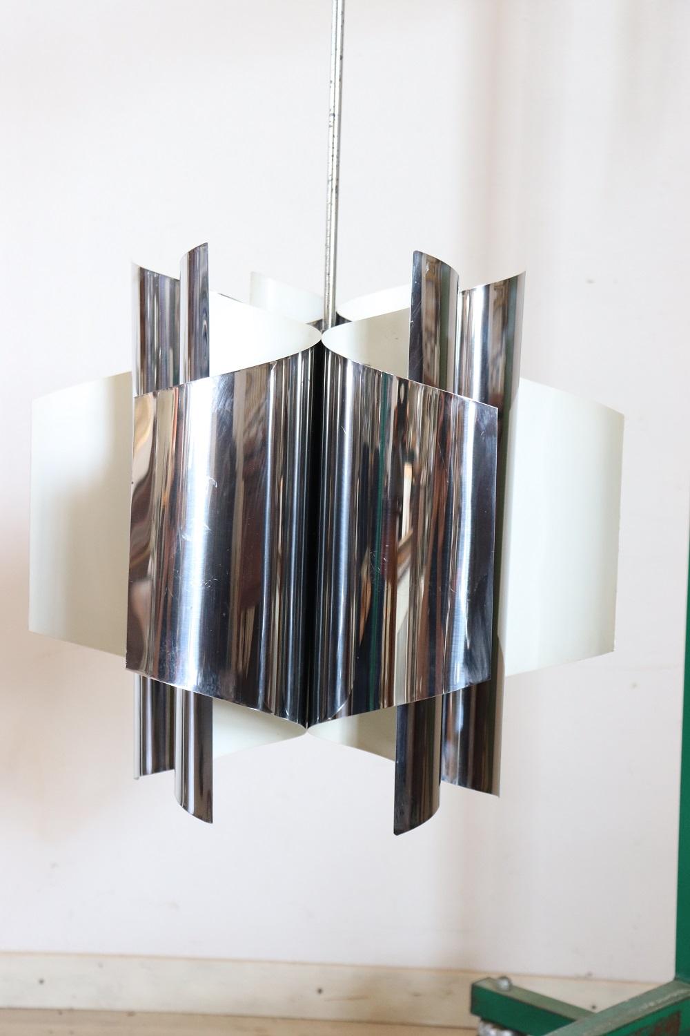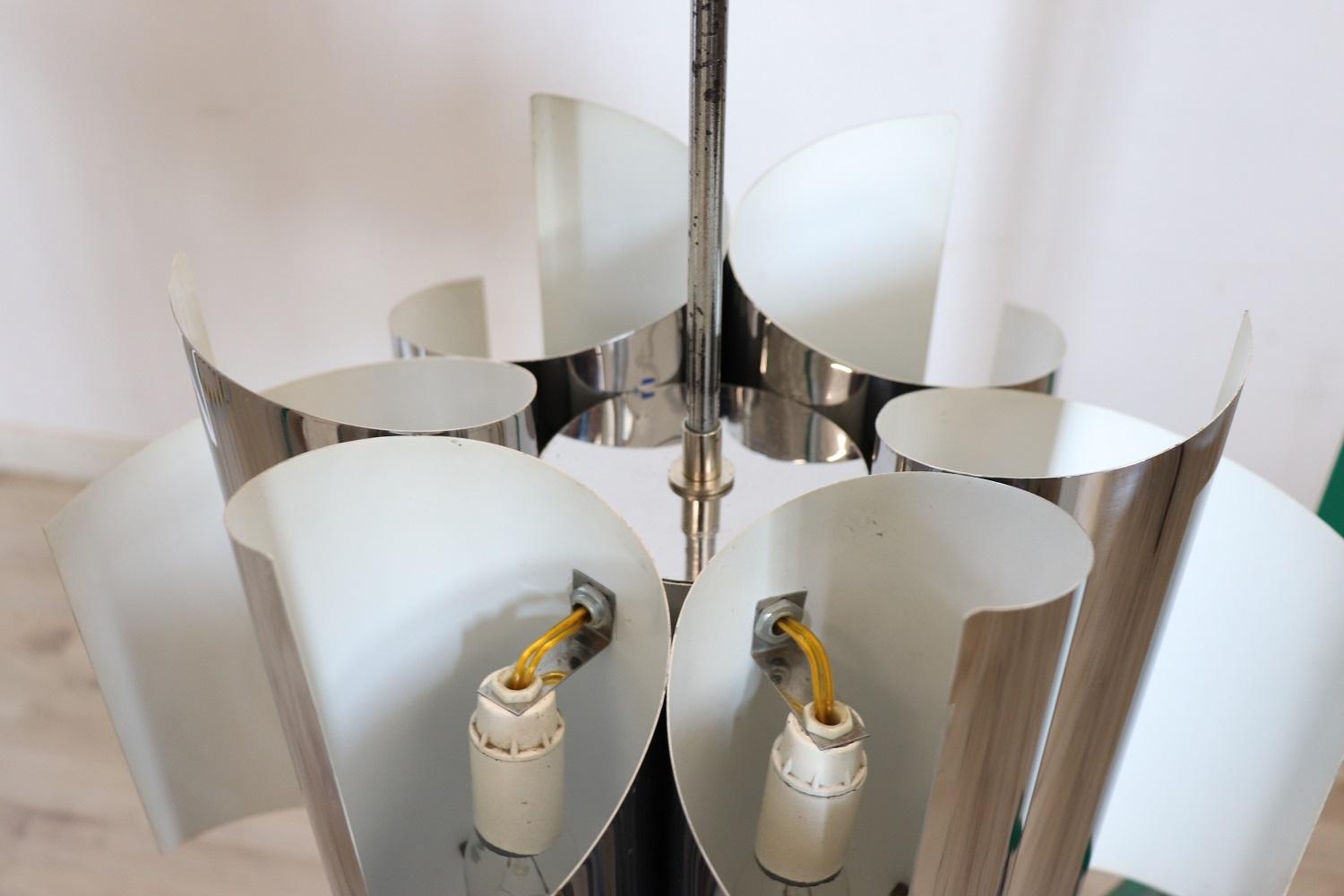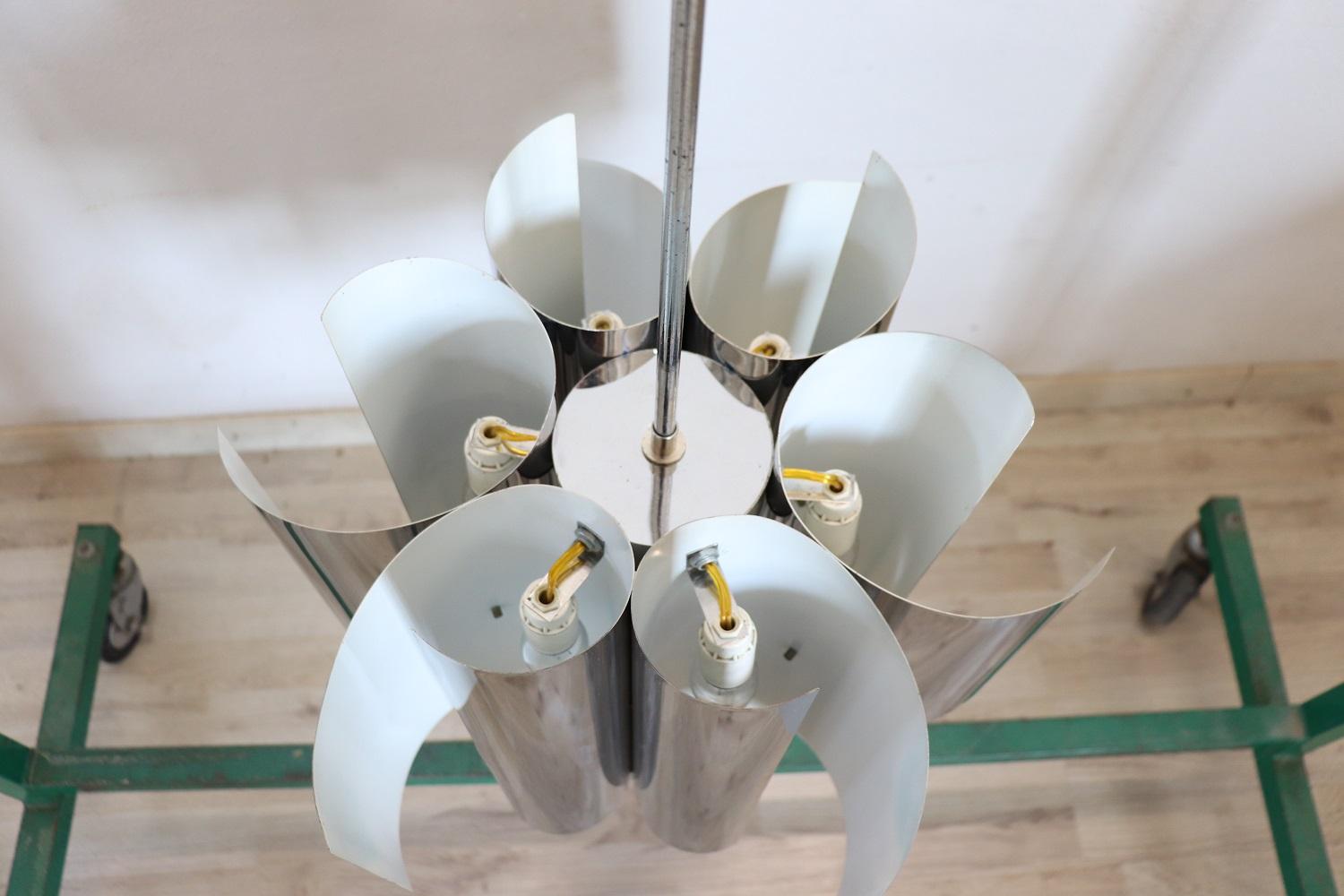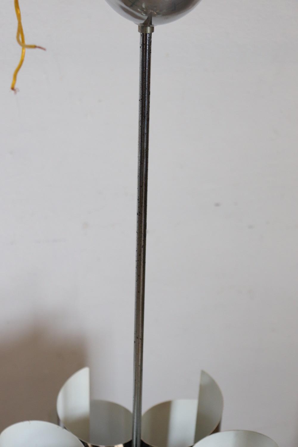 Lampadario Space Age a 6 luci in acciaio, anni ’70. Bellissimo lampadario design italiano periodo space age in acciaio a sei luci, anni ’70. Condizioni perfette e perfettamente funzionante. Proposto ad un prezzo trattabile vi invitiamo ad inviarci le vostre proposte di acquisto le valuteremo con piacere. Vi consigliamo di guardare bene in dettaglio tutte le foto allegate. MISURE IN CM Altezza 88 cm Diametro 44 cm – imballo professionale spedizioni assicurate con corrieri consegna su appuntamento solo piano strada no facchinaggio ai piani.
