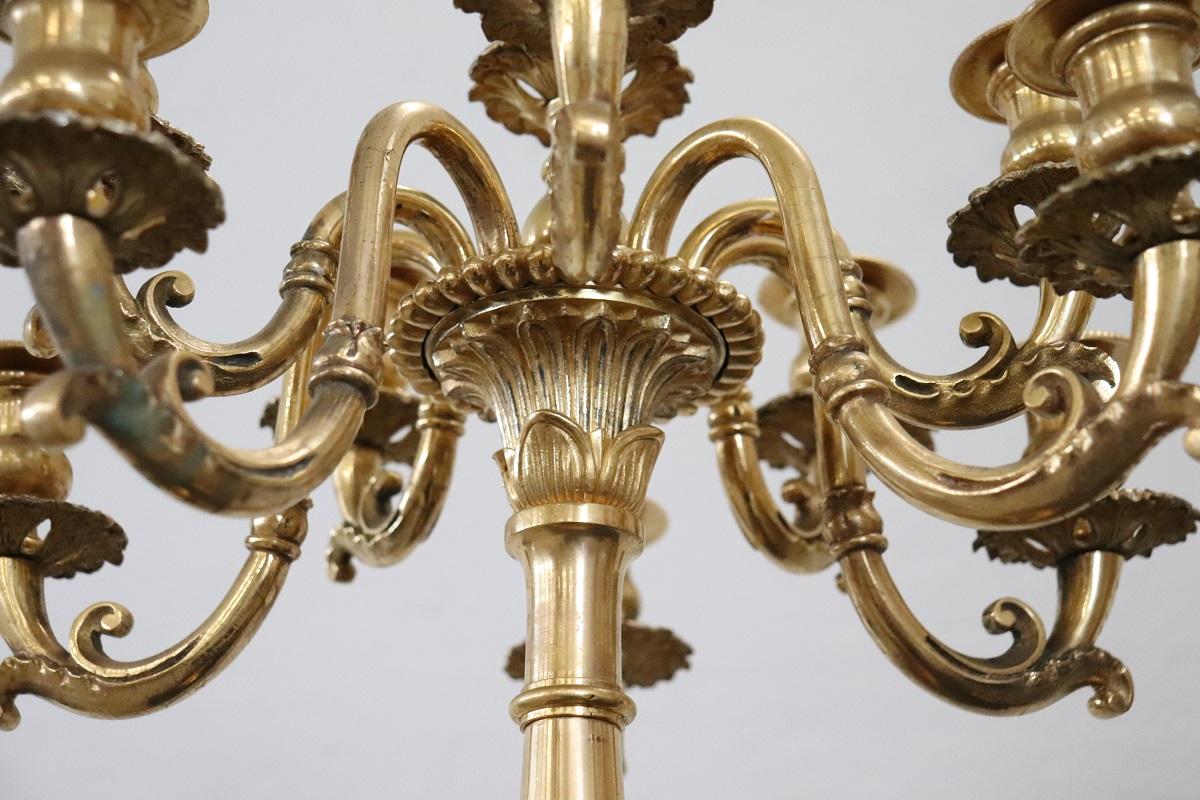 Maestosa coppia di candelieri antichi in bronzo dorato secolo XIX. Rara coppia di grandi candelieri da tavolo antichi in bronzo dorato a undici fiamme ciascuno, databili verso la fine del XIX secolo. Grande qualità artistica. Caratterizzati da una base circolare su piedi felini, i bracci hanno una doppia spirale. Il bronzo presenta una bella decorazione di gusto classico. Maestosi, perfetti per abbellire un tavolo importante, saranno ammirati da tutti i vostri ospiti. Se il cliente lo desidera è possibile effettuare elettrificazione, sono già predisposti ma manca l’impianto elettrico. Ottime condizioni. Si prega di guardare tutte le foto in dettaglio. Prezzo trattabile inviateci la vostra migliore proposta di acquisto.