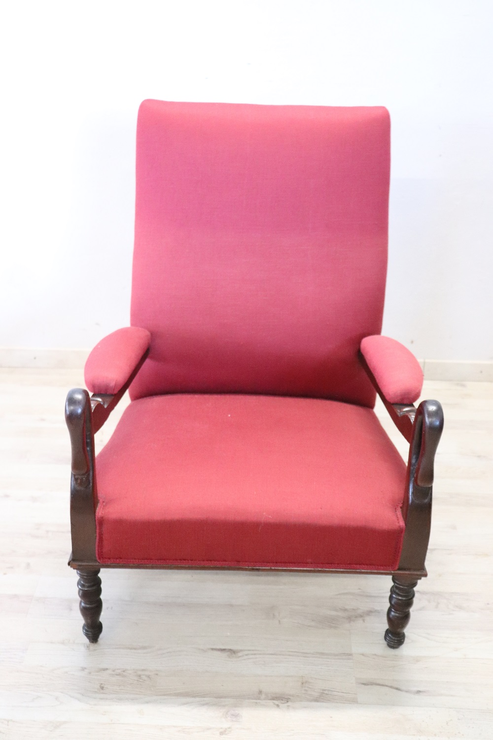 Bellissima poltrona antica prima metà del secolo XIX. In legno di noce con elegante tessuto rosso. Caratterizzata da un raffinato lavoro ad intaglio nel legno con braccioli a testa di cigno. Seduta comoda avvolgente ideale da relax o conversazione. Perfette condizioni generali sia del legno che di tappezzeria e tessuto. Vi consigliamo comunque di guardare bene in dettaglio tutte le foto allegate. Proposta ad un’ottimo prezzo trattabile vi invitiamo ad inviarci le vostre proposte di acquisto le valuteremo con piacere.