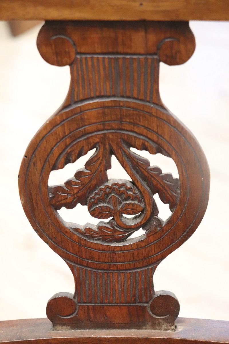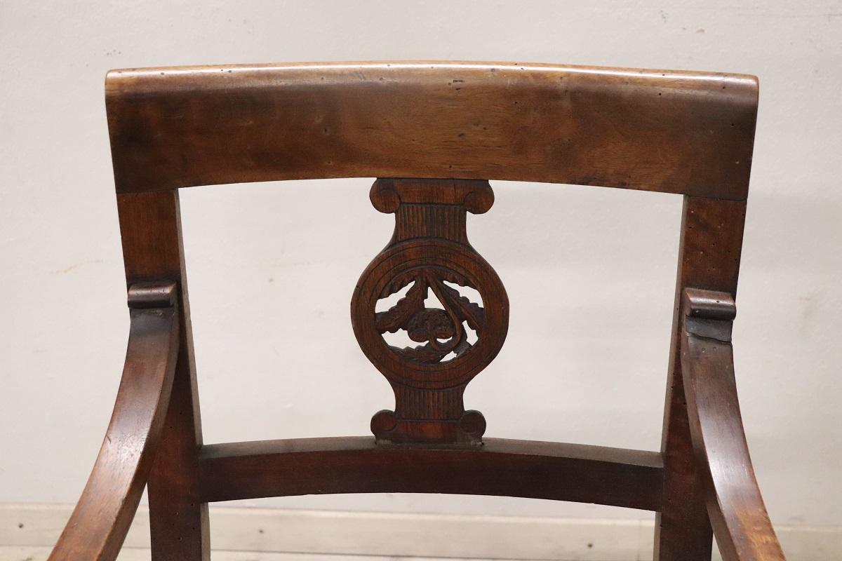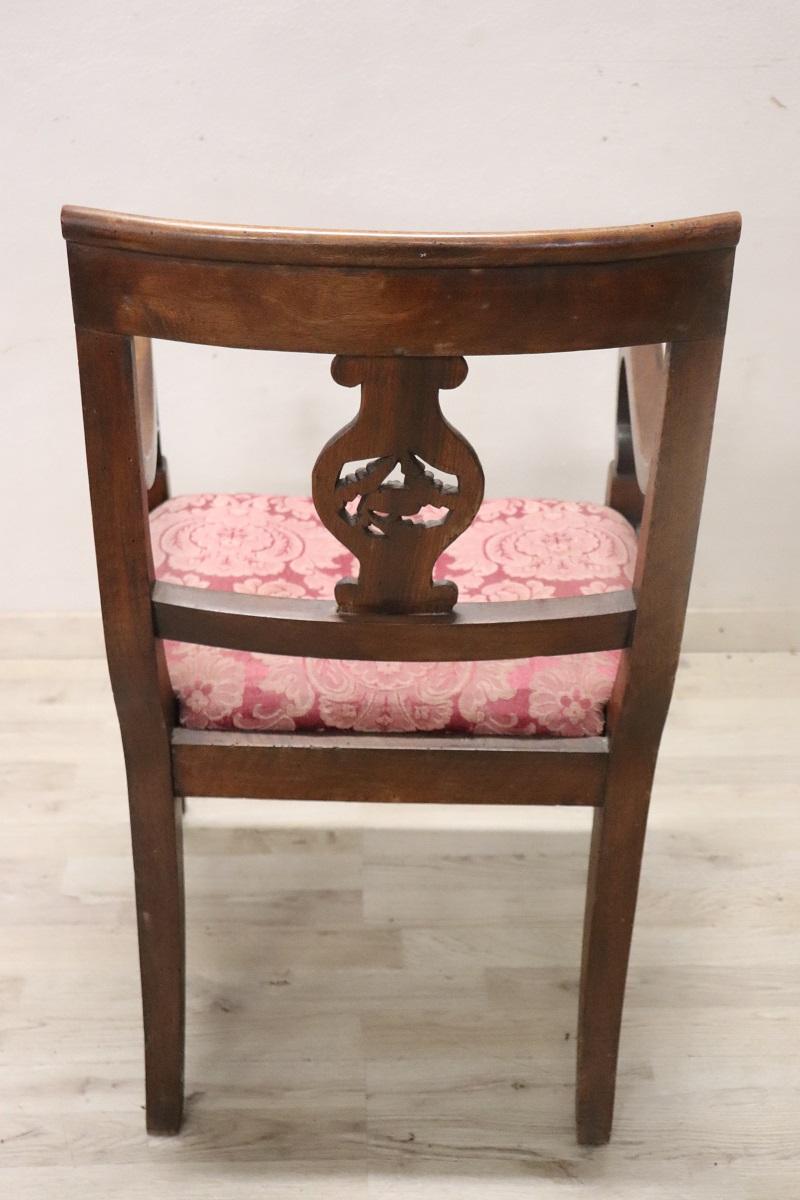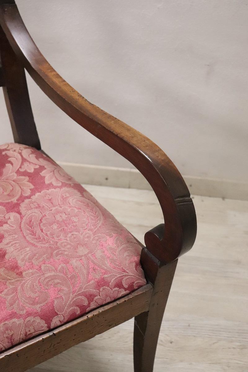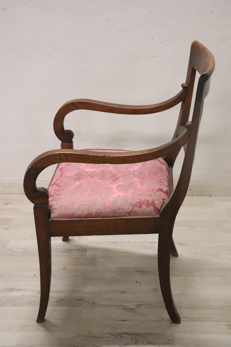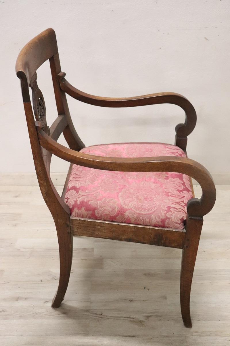 Poltrona Direttorio antica in noce fine secolo XVIII. Bellissima poltrona antica italiana periodo Direttorio fine del XVIII secolo in legno di noce massello. La poltrona è molto elegante. Bellissimo lo schienale decorato con intaglio classico, importanti i due braccioli a ricciolo. La seduta è imbottita e rivestita in tessuto damascato. Perfetta per essere utilizzata come sedia per scrivania. Si consiglia il restauro dell’imbottitura e il cambio del tessuto. Prezzo trattabile vi invitiamo ad inviarci le vostre proposte di acquisto le valuteremo con piacere. Vi consigliamo comunque di guardare bene in dettaglio tutte le foto allegate.