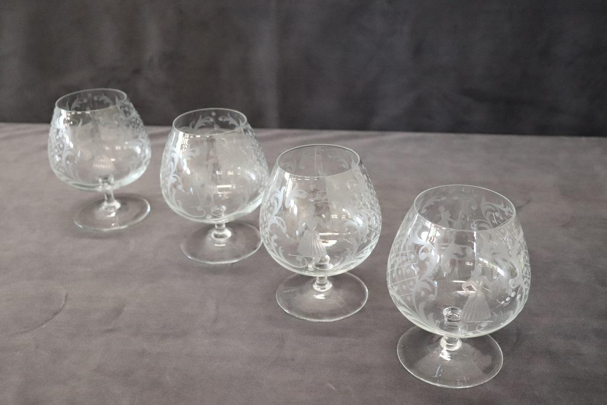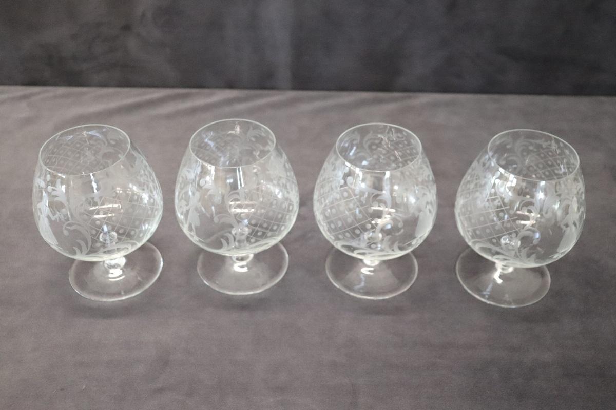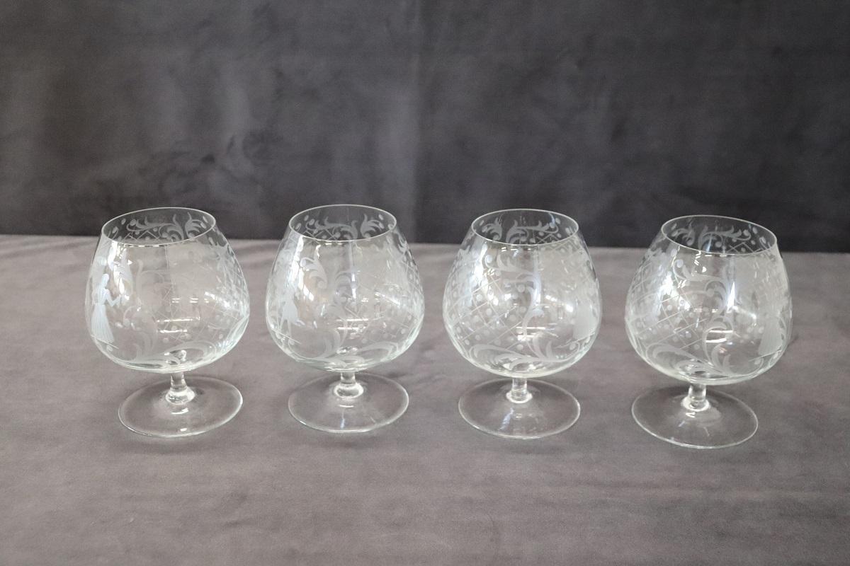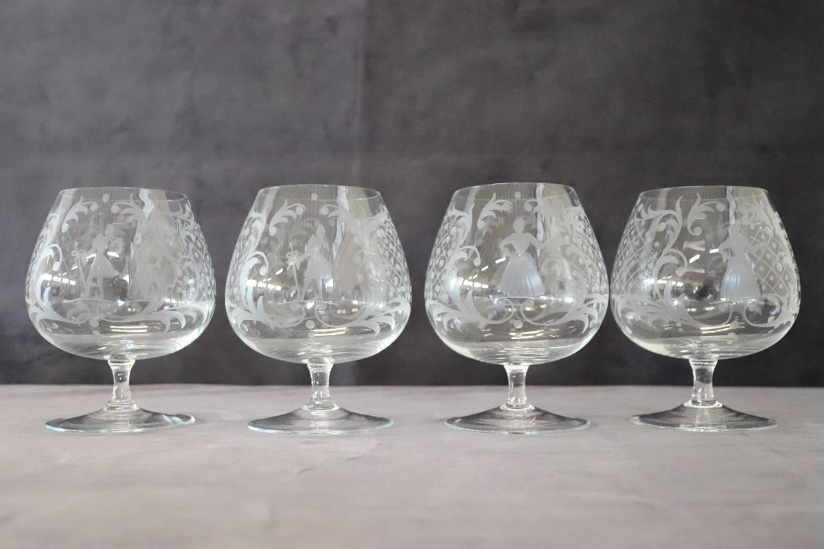 Set di 4 raffinati bicchieri da cognac. Questo set di bicchieri veneziani degli anni ’60 circa è un’opera d’arte che trasforma ogni sorso di cognac in un’esperienza unica e sontuosa. Ogni bicchiere, realizzato con maestria artigianale, riflette l’abilità e la tradizione secolare del vetro veneziano. Le delicate incisioni, eseguite a mano, non solo aggiungono un tocco estetico distintivo, ma raccontano anche una storia di eleganza e nobiltà attraverso i loro complessi motivi.