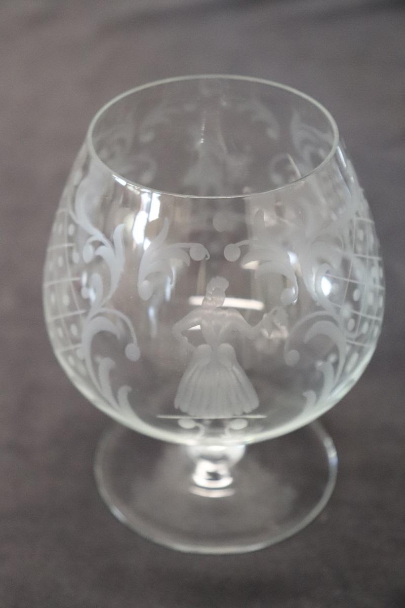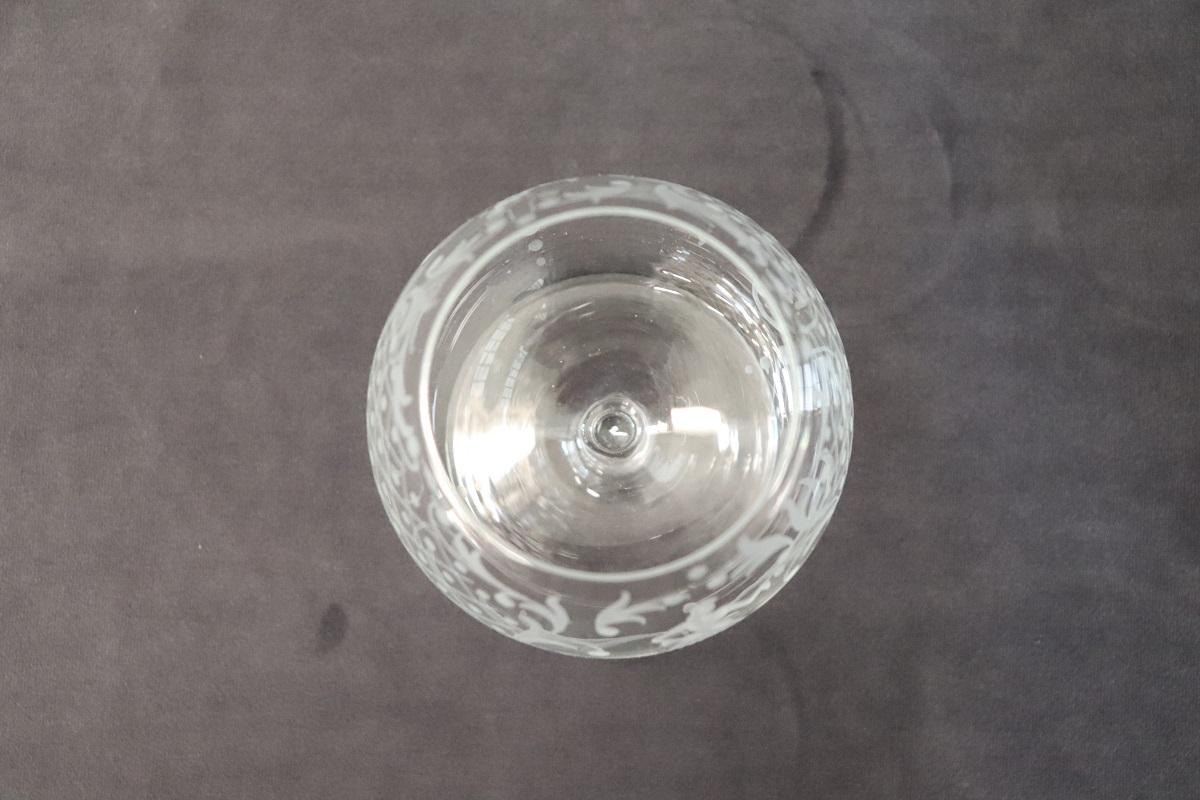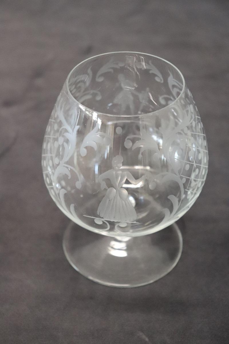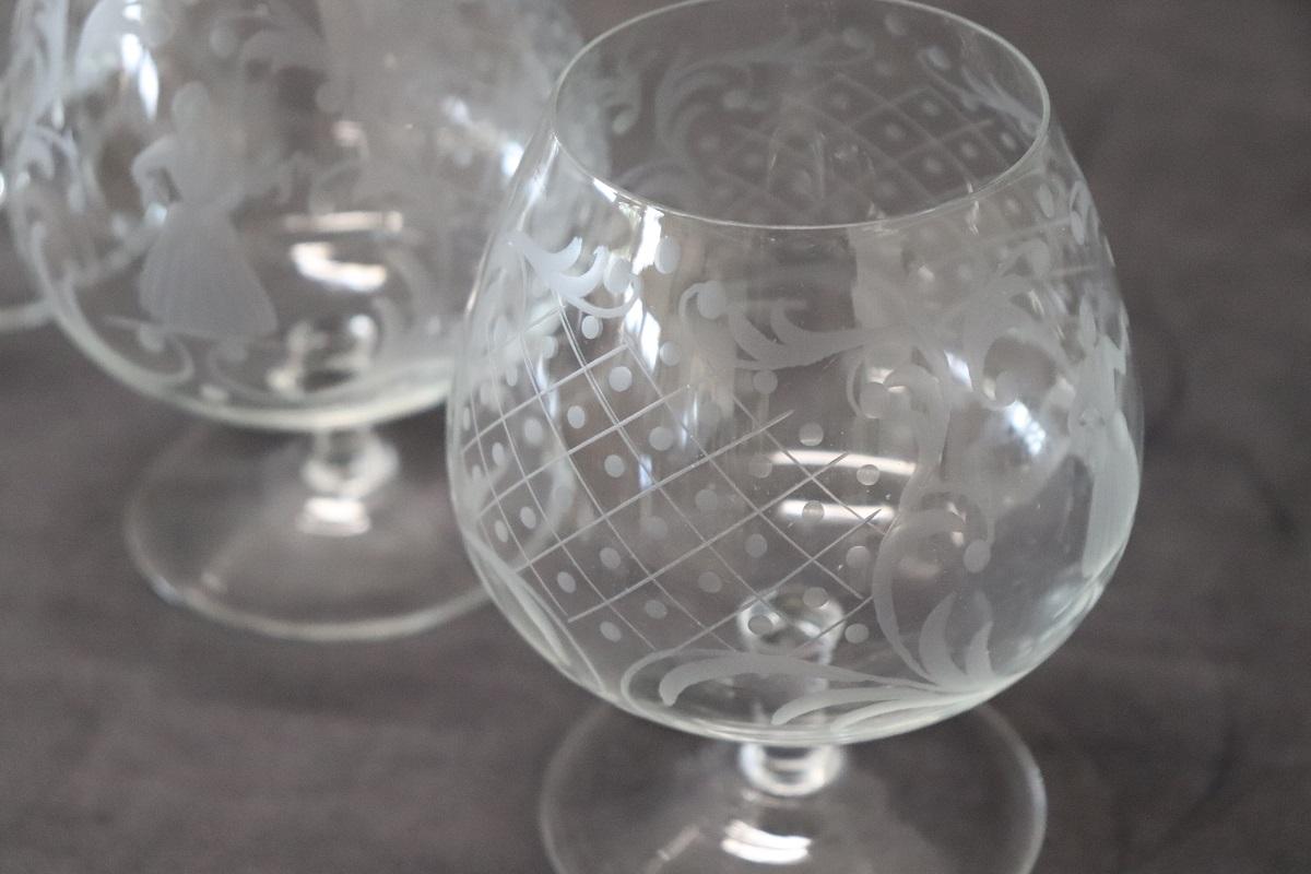 Set di 4 raffinati bicchieri da cognac. Questo set di bicchieri veneziani degli anni ’60 circa è un’opera d’arte che trasforma ogni sorso di cognac in un’esperienza unica e sontuosa. Ogni bicchiere, realizzato con maestria artigianale, riflette l’abilità e la tradizione secolare del vetro veneziano. Le delicate incisioni, eseguite a mano, non solo aggiungono un tocco estetico distintivo, ma raccontano anche una storia di eleganza e nobiltà attraverso i loro complessi motivi.