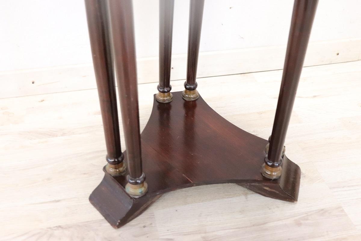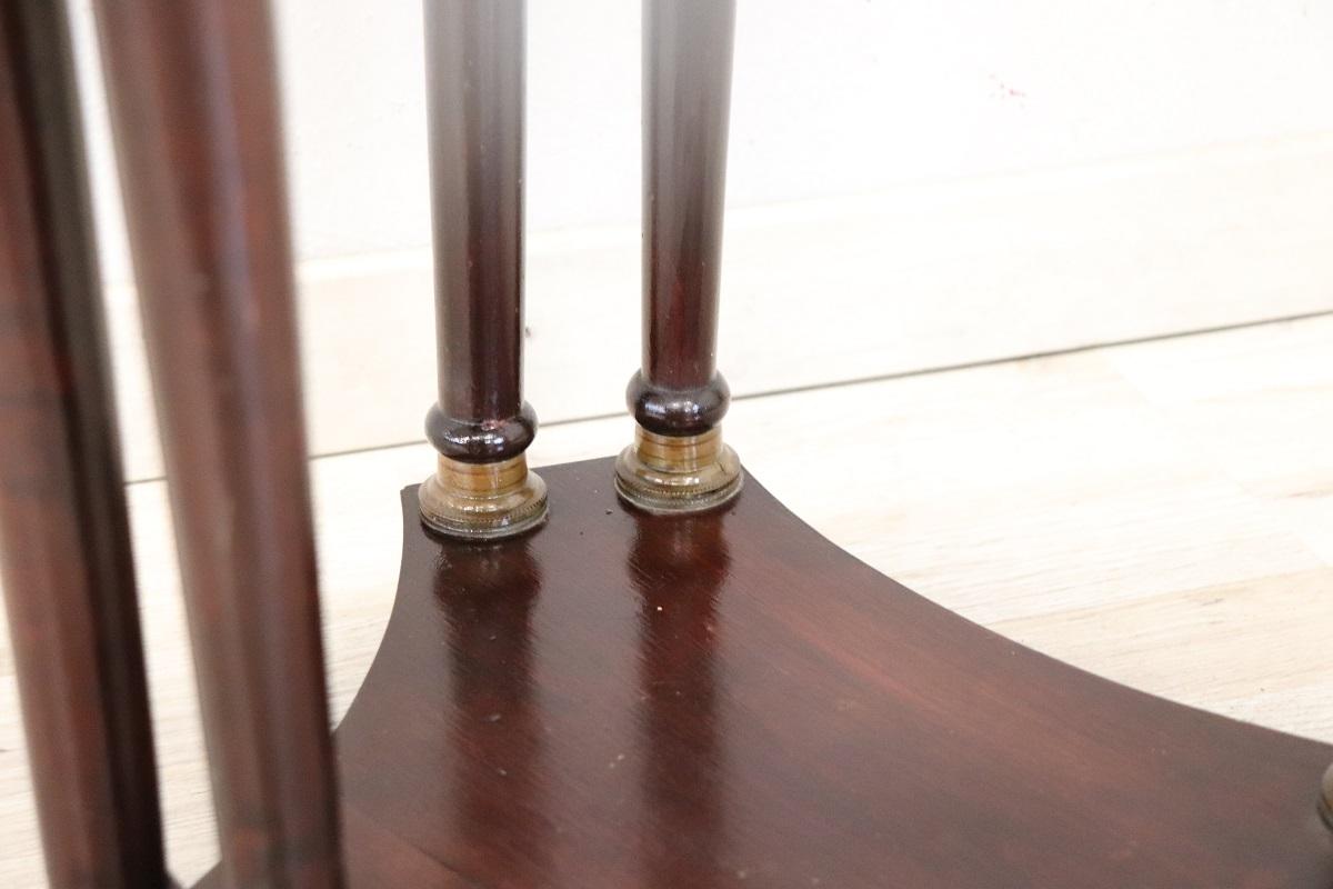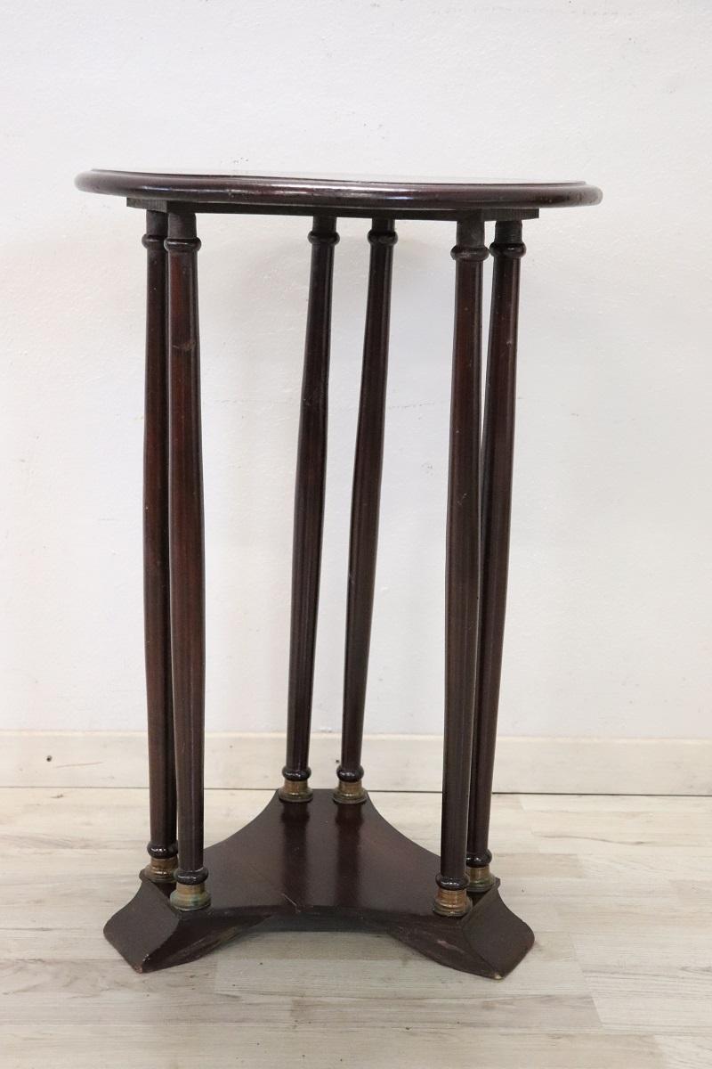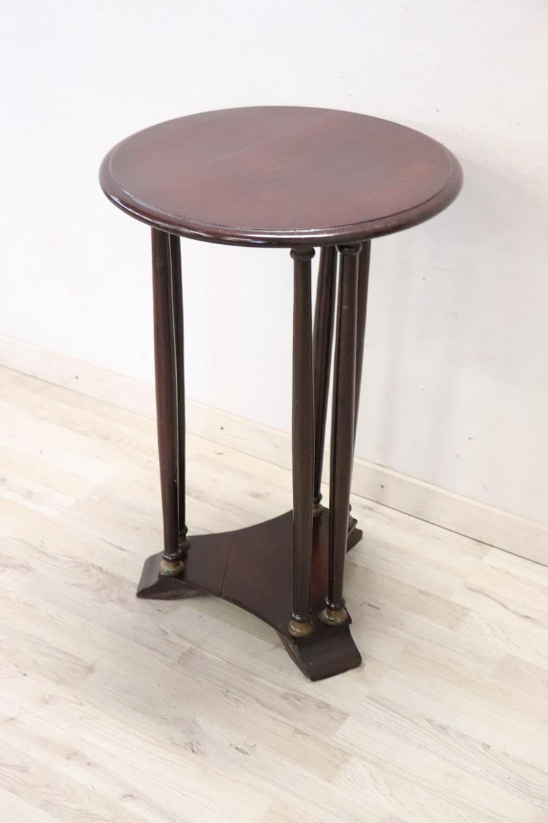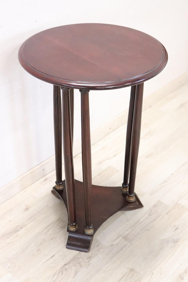 Tavolino da salotto in stile Impero secolo XX. Tavolino da salotto gueridon rotondo in stile impero realizzato in legno di faggio. Databile nella seconda metà del secolo XX. Il piano è sostenuto da tre coppie di raffinate colonne. Nella parte inferiore le colonne terminano con una deliziosa decorazione in bronzo. Perfetto per sostenere un vaso o un oggetto decorativo poco pesante. Trattandosi di articolo usato si prega di guardare bene tutte le foto allegate. Prezzo trattabile potete inviarci le vostre proposte di acquisto le valuteremo con piacere vi invitiamo ad inviarci le vostre proposte di acquisto le valuteremo con piacere.