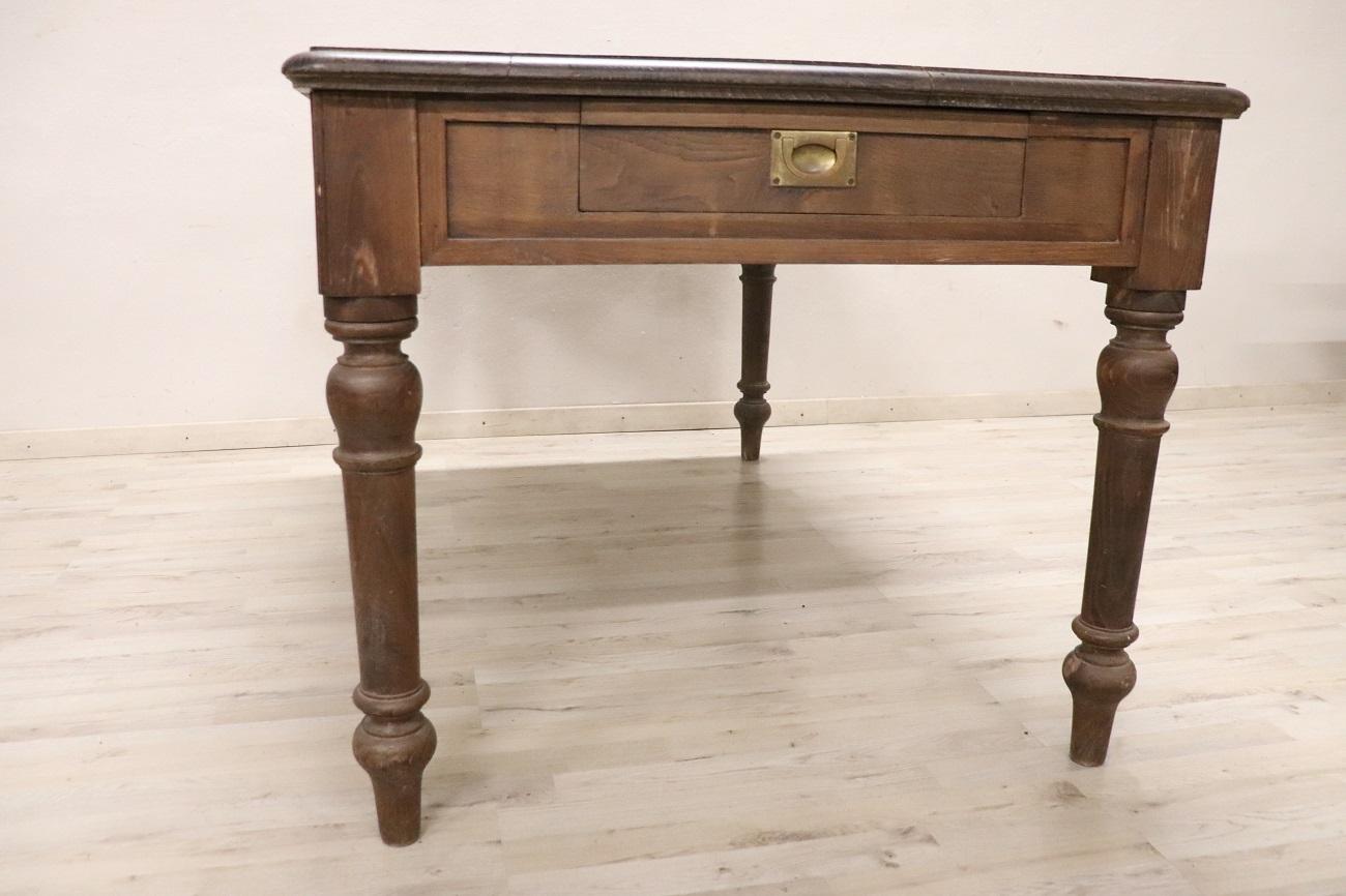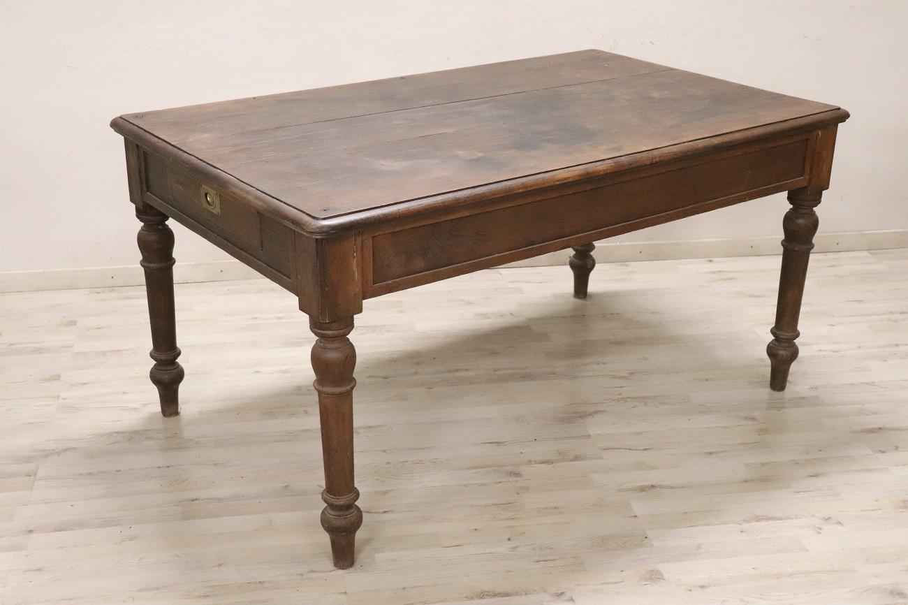 È importante notare che sul piano del tavolo sono presenti alcune macchie scure che sono penetrate nel legno e non possono essere rimosse completamente. Tuttavia, con un attento restauro, questi segni possono essere valorizzati, accentuando il fascino rustico piuttosto che comprometterlo.