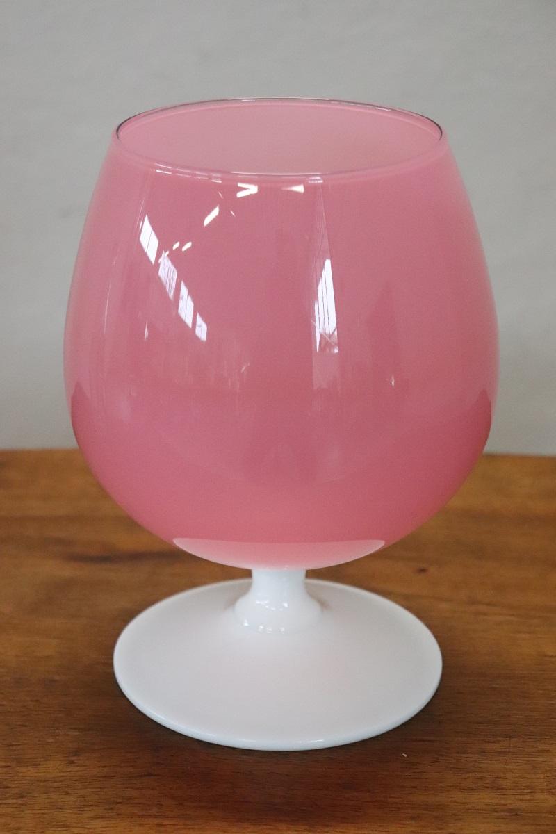 Questo squisito pezzo presenta una forma a calice unica, che mette in mostra un delizioso contrasto di colori. L’accattivante vetro opalino rosa attira l’attenzione, mentre la base bianca completa splendidamente il rosa, esaltandone l’eleganza complessiva.