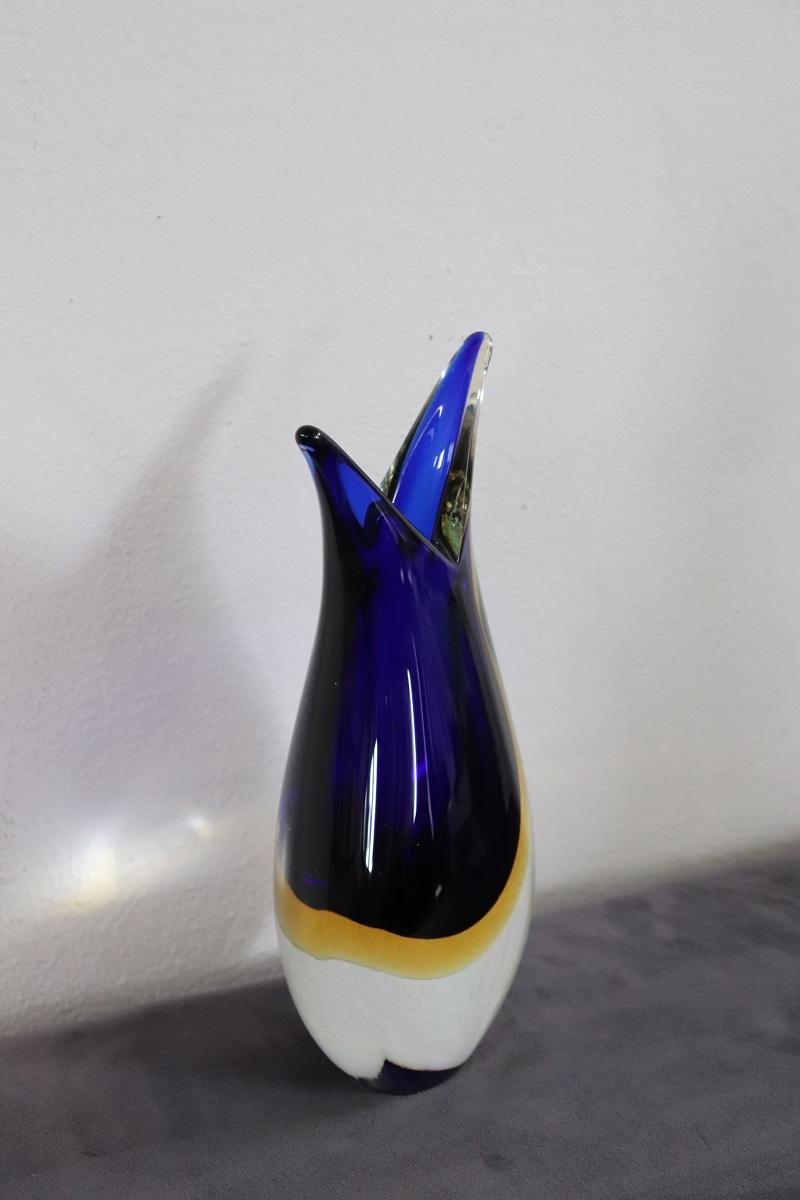 Vaso Murano anni ’70 vetreria Formia. Vaso in vetro artistico di Murano blu, giallo e trasparente, design italiano, anni ’70 circa. Un bellissimo vaso dai colori intensi, il blu ha una qualità e un’intensità uniche. La presenza dell’etichetta originale d’epoca è una vera rarità. Realizzato da Formia, storica vetreria muranese che ha creato importanti vasi dal design iconico. Questo vaso è realizzato in vetro spesso. È estremamente decorativo. Questo vaso è realizzato con la tecnica del vetro sommerso. La tecnica di lavorazione chiamata vetro sommerso diventerà una tecnica di eccellenza eseguita sovrapponendo diversi strati di vetro con consistenza e colori differenti. L’effetto multicolore è impressionante! Questo prezioso vaso è una vera e propria opera d’arte in vetro e può essere collocato in qualsiasi ambiente della casa. Ottime condizioni vintage, prezzo trattabile. MISURE IN CM Altezza 26 cm Larghezza 14 Profondità 9 – imballo professionale spedizioni assicurate con corrieri consegna su appuntamento solo piano strada no facchinaggio ai piani.