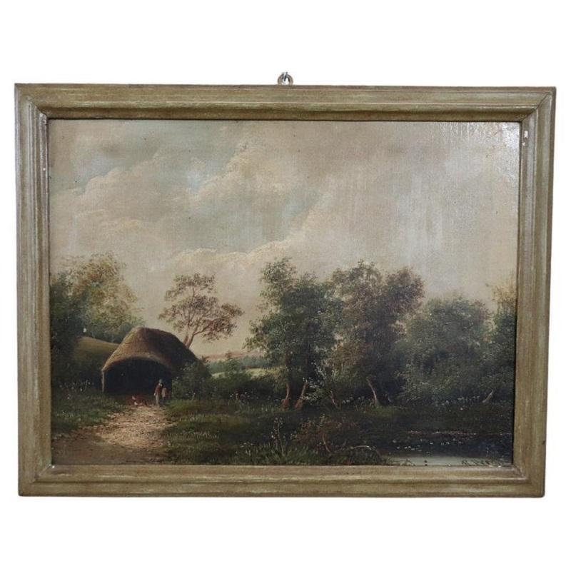 A signed 19th-century English School oil painting on canvas. This exquisite oil painting on canvas from the English School, dating from the late 19th century, captivates with its serene depiction of a wooded landscape. The painting bears a signature in the lower right corner, but the artist has not been identified. The work demonstrates a remarkable level of skill and attention to detail.