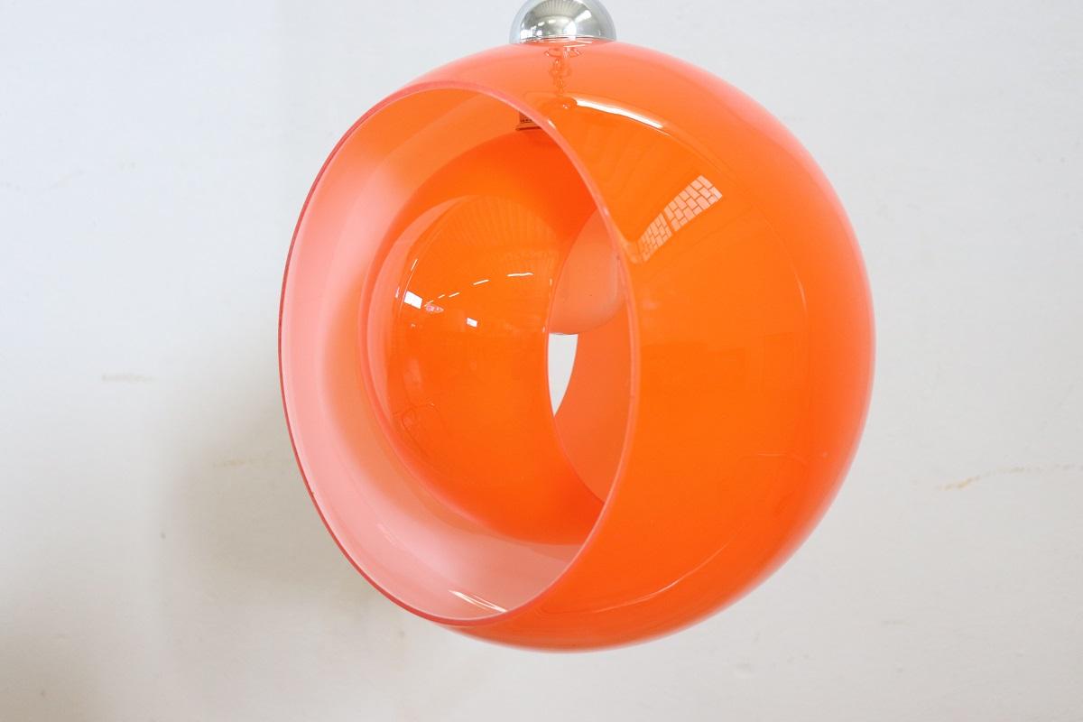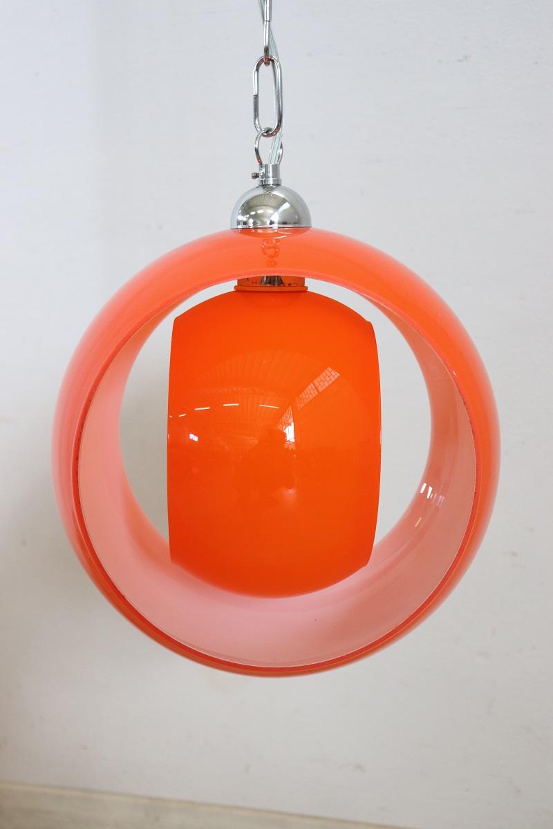 We present this Italian design suspension lamp in Murano glass from the 1960s. Made of fine Murano glass, orange on the outside and white on the inside, obtained thanks to a technique called “vetro incamiciato” (clad glass). The lamp has a fantastic futuristic design that perfectly represents the space age. Two circular glass shades, one inside the other, can rotate to create fantastic light effects. The optical effect of the light hitting the orange glass is striking.